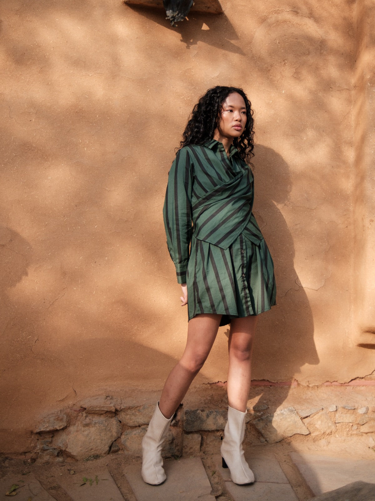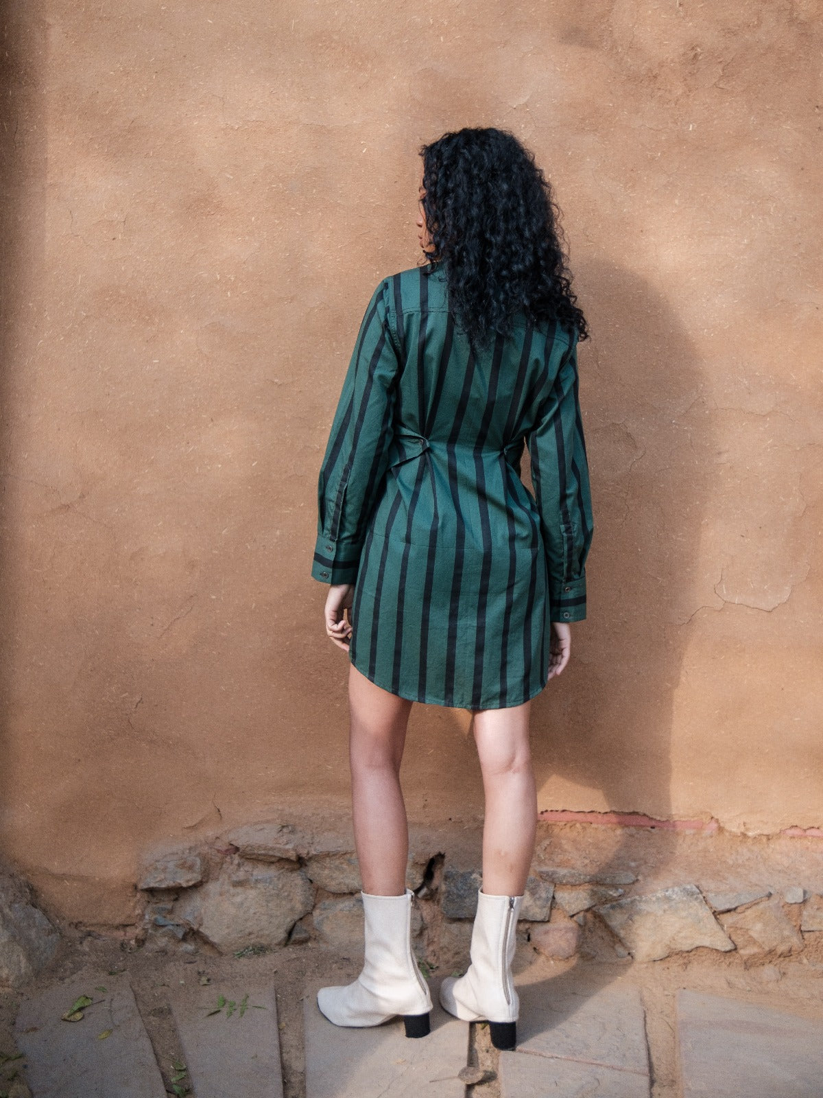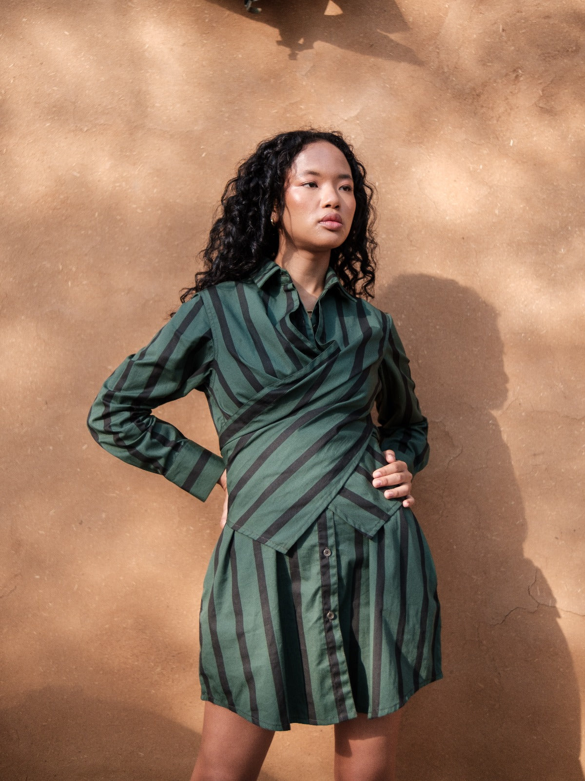 The Deep Green Stripes Seattle Wrap Shirt Dress is a versatile piece that blends timeless elegance with everyday comfort. Crafted for a tailored fit, it features a classic wrap design accentuated by deep green stripes that add subtle sophistication. This dress effortlessly transitions from professional environments to relaxed weekend outings, making it a reliable choice for diverse occasions. Its breathable fabric ensures all-day comfort, while the adjustable waist tie allows for a personalized silhouette. Elevate your wardrobe with this expertly designed dress that combines function and style in perfect harmony.