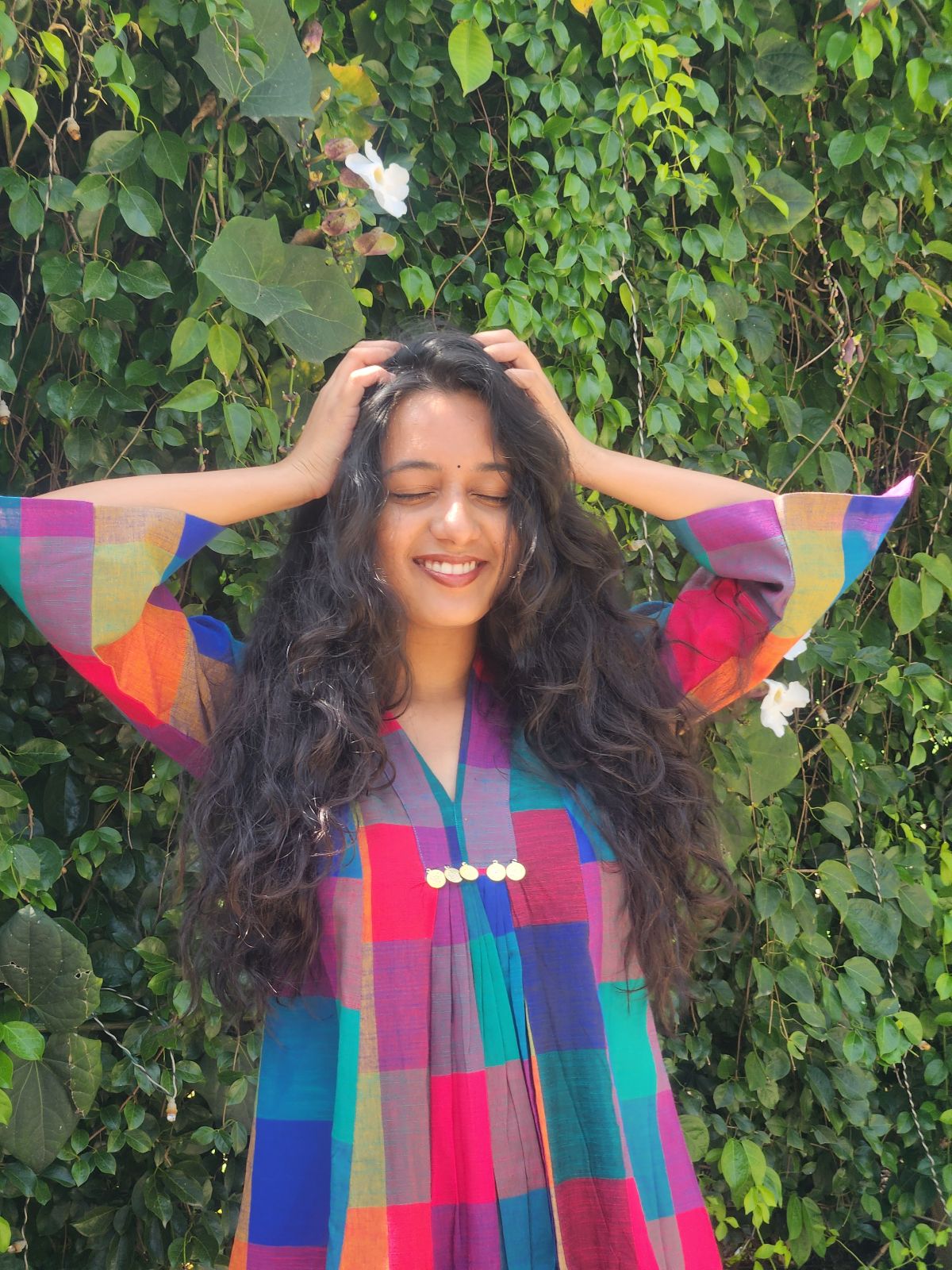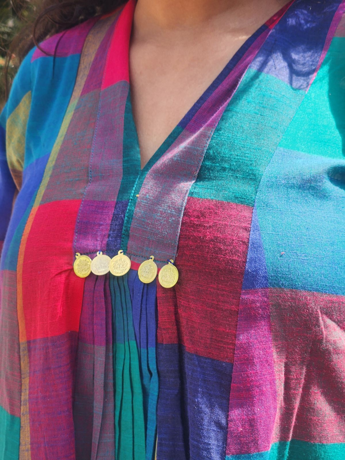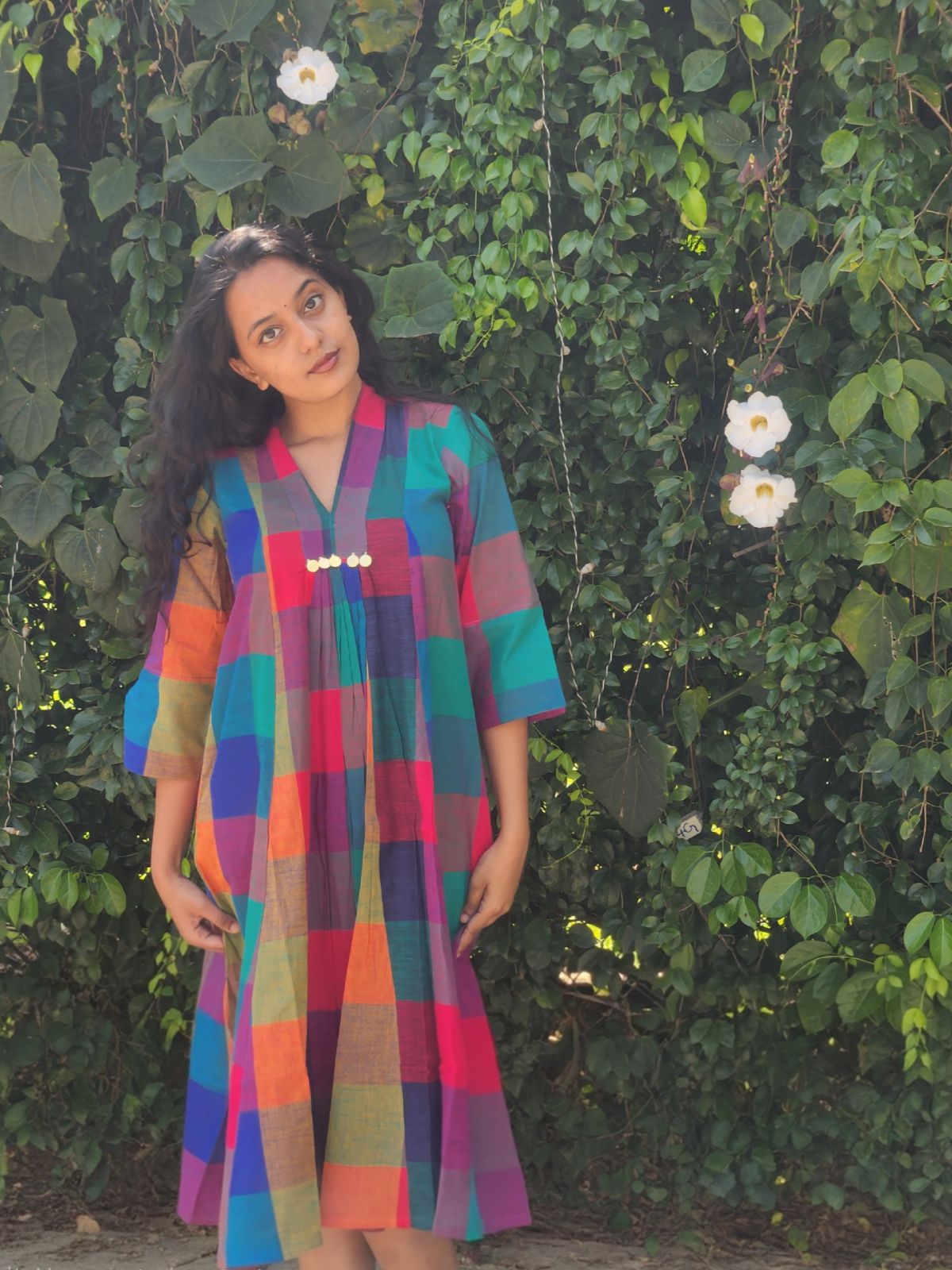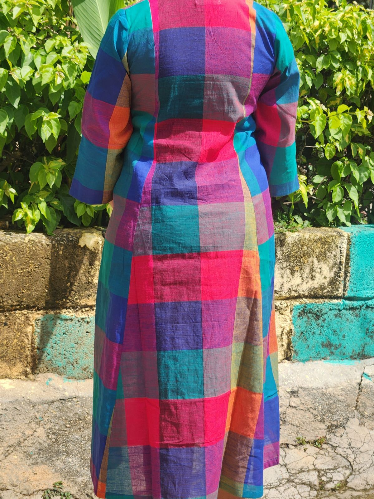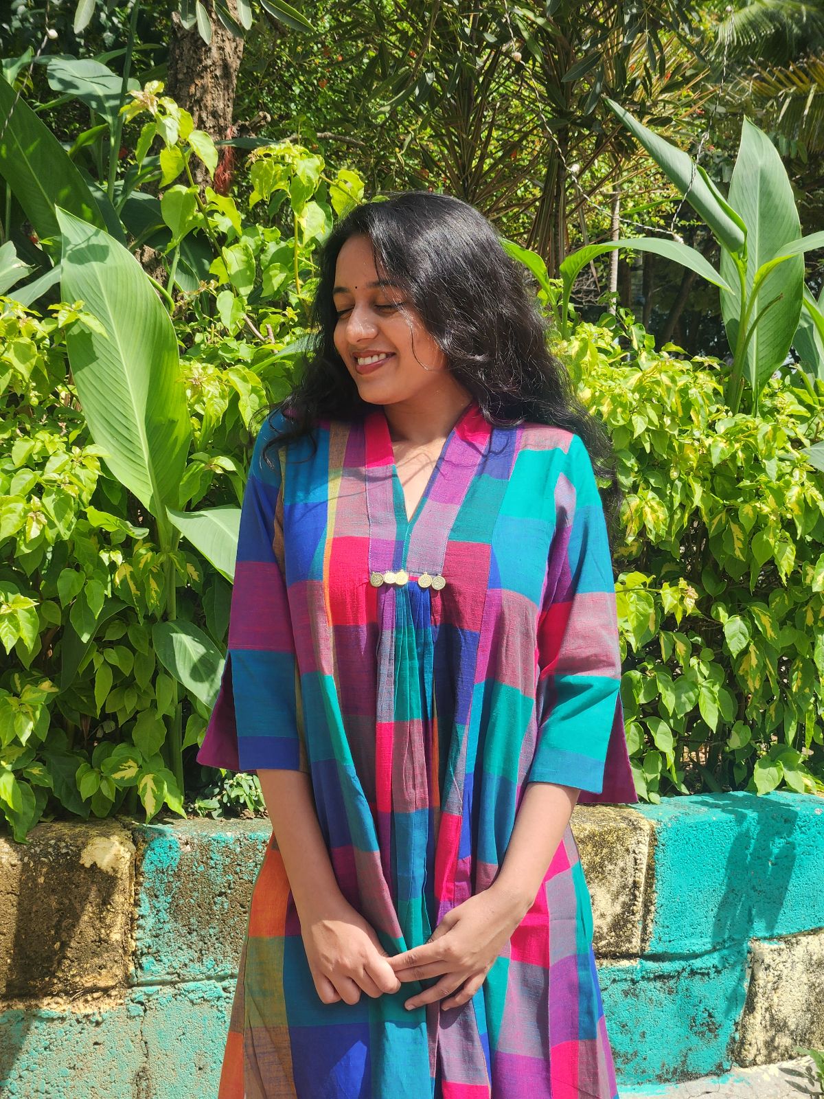 This Mughal-inspired flare dress features meticulously panelled, hand-woven blue Madras checks that skim and swing with ease. A practical side pocket meets hand-done coin detailing for artisanal charm. Soft, breathable, and seasonless, it moves from daytime errands to festive gatherings with effortless grace and versatile styling potential.