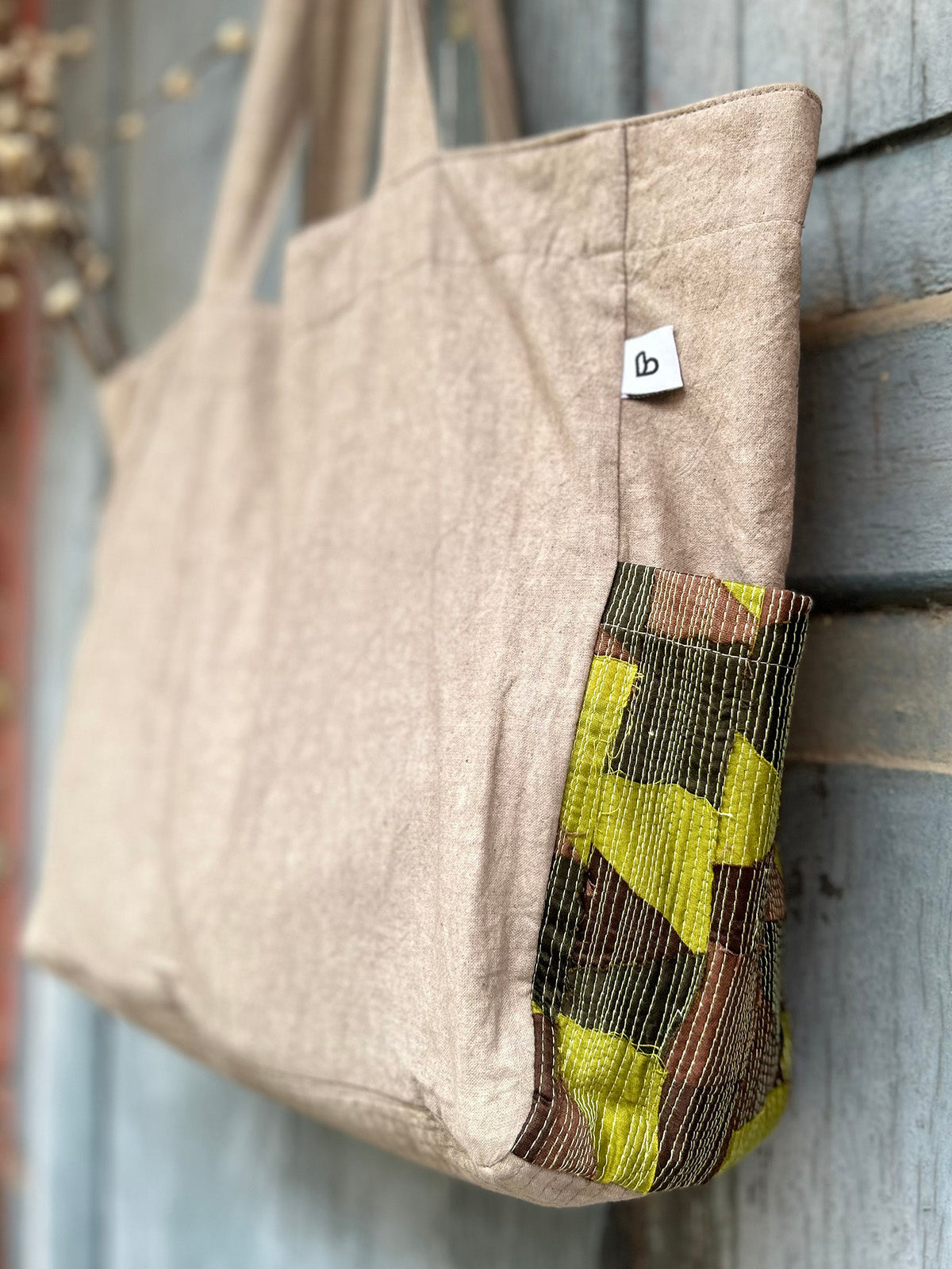Unisex Cotton Charcoal Grey Tote Bag has multi-colour Chindi Patch Pocket at both sides.