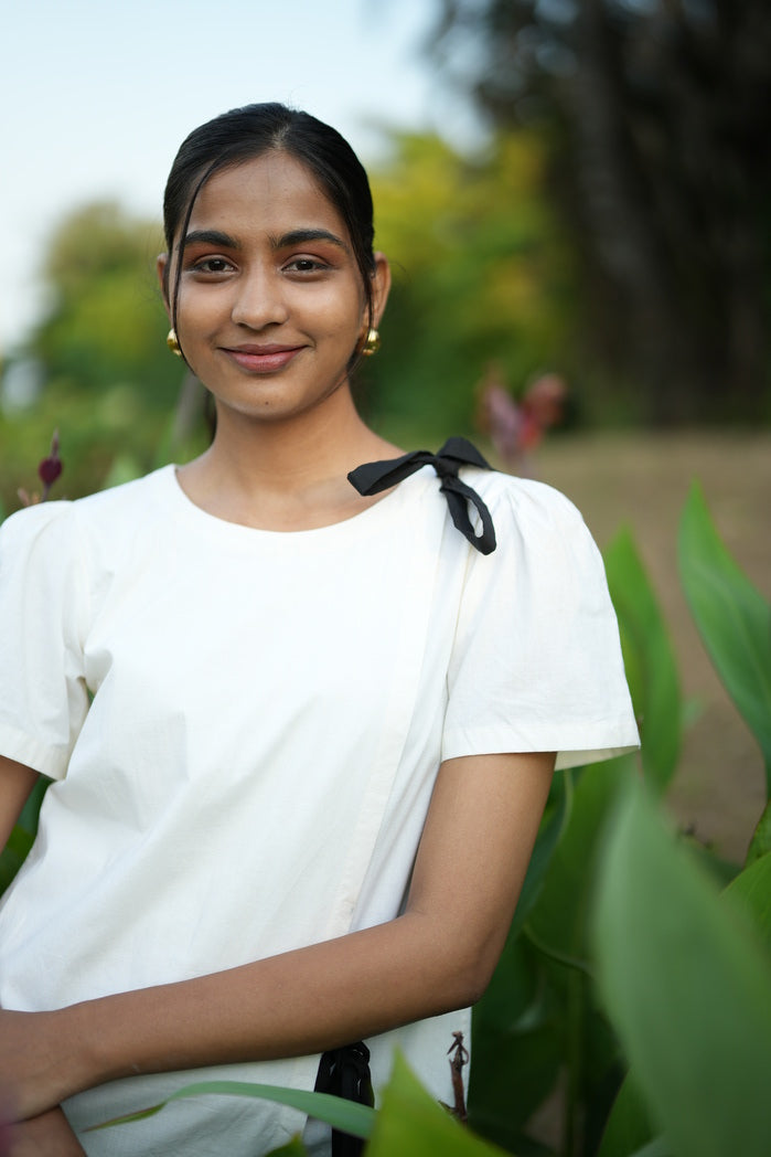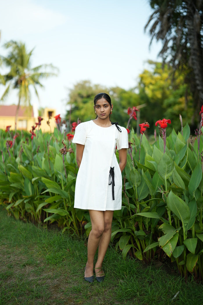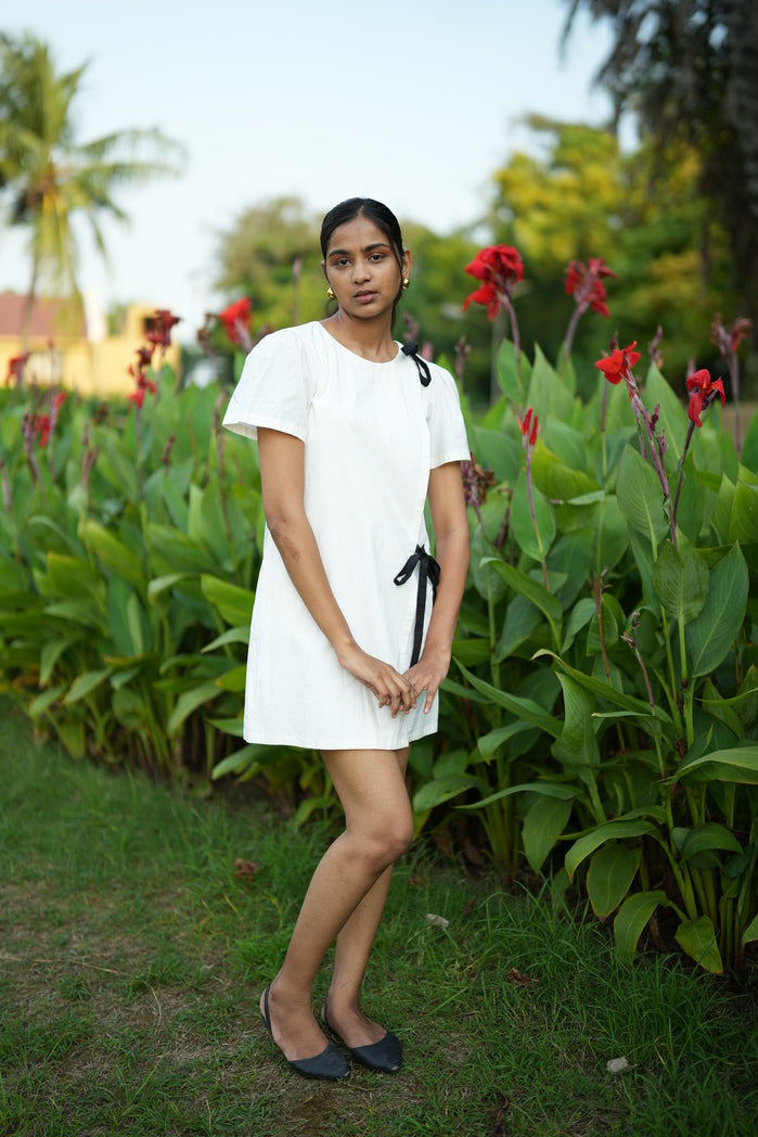 Effortless and stylish, this white A-line short dress is perfect for any occasion. Crafted from breathable fabric, it keeps you cool and comfortable. The relaxed silhouette and above-the-knee hem offer laid-back elegance, while the chic black shoulder ribbon adds a touch of contrast. Wear with heels or flats for easy sophistication.