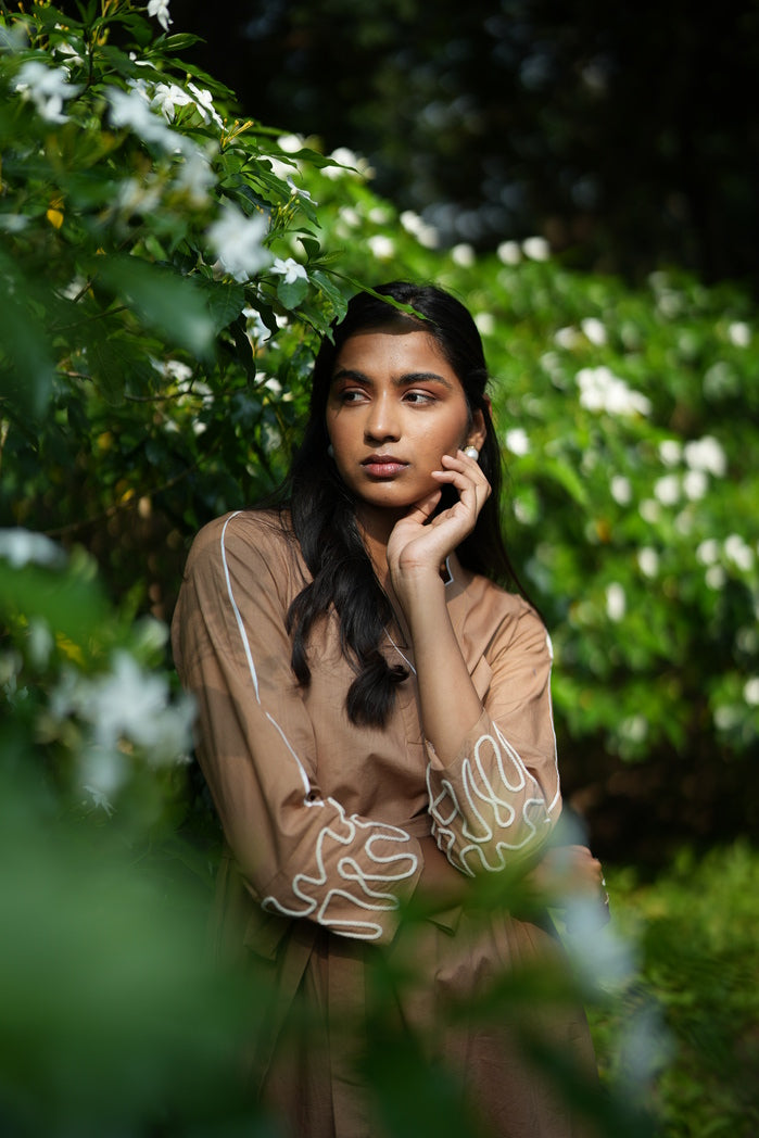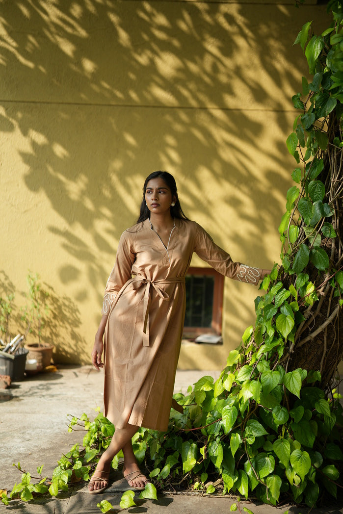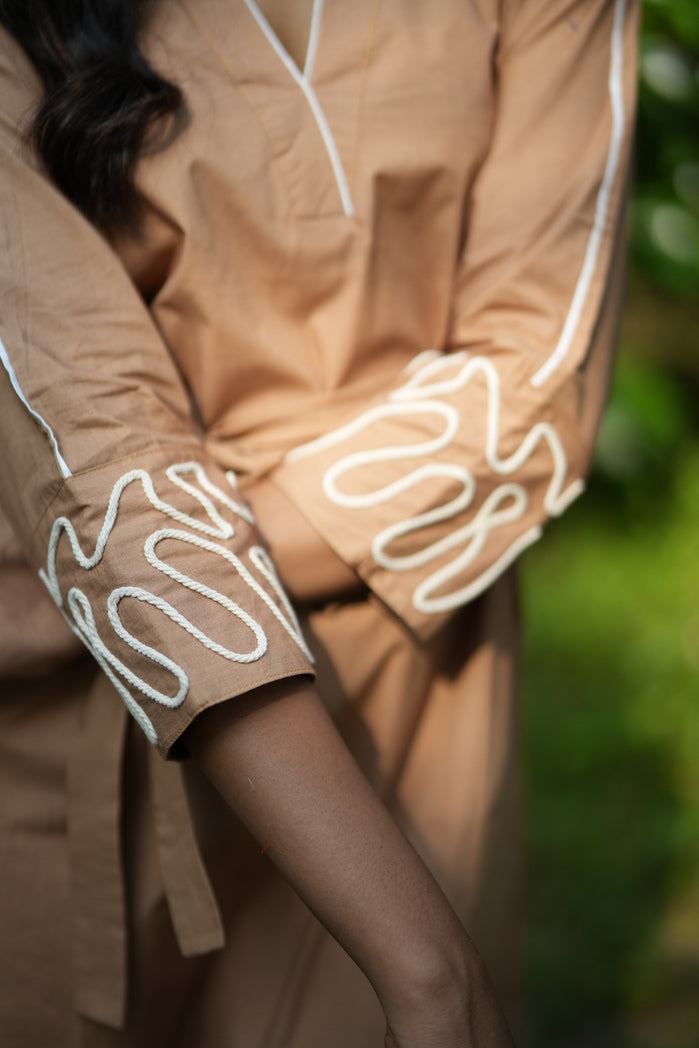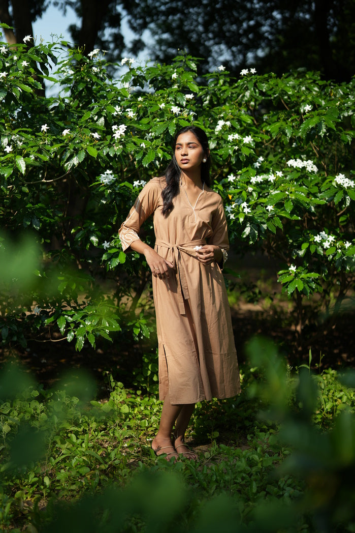 Effortlessly elegant and easy to wear, this warm beige midi dress is perfect for any occasion. The soft V-neckline with delicate stitching detail adds a touch of sophistication, while the three-quarter sleeves bring both style and comfort. The white embroidery at the cuffs creates a subtle yet beautiful contrast, giving the dress a unique, artistic touch. With its flowy silhouette and breathable fabric, this dress is perfect for casual outings, garden parties, or semi-formal events.