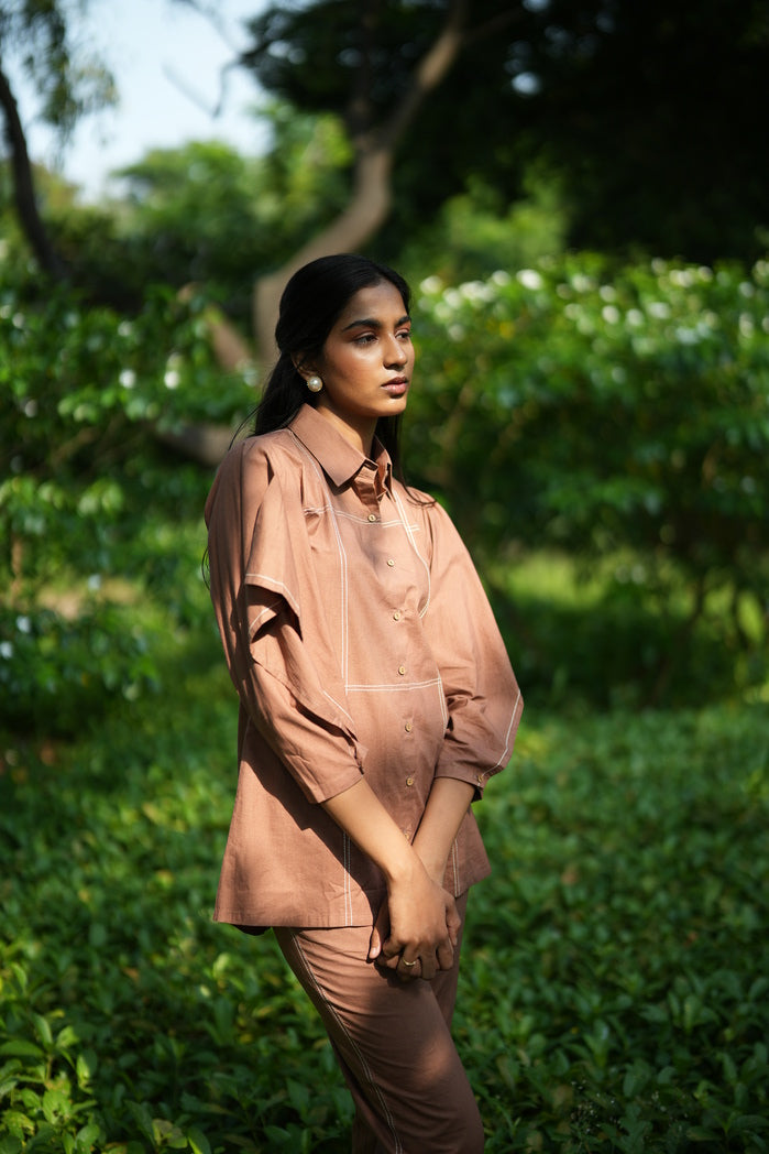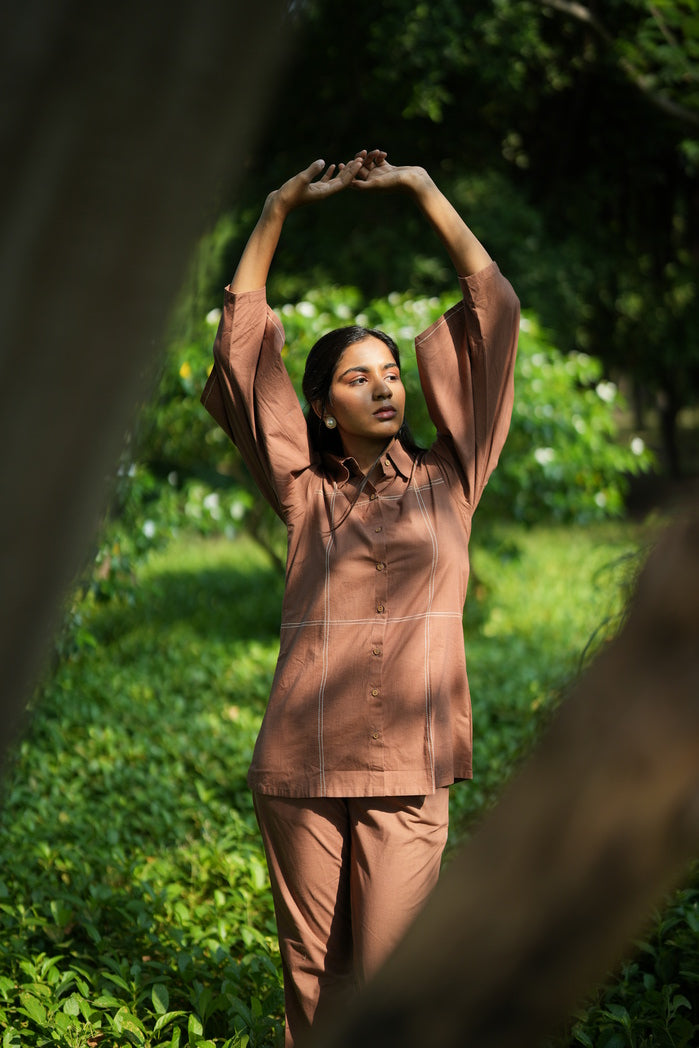 Effortless style meets all-day comfort with the Fiji Scoop Set. This loose, button-up shirt in a warm brown shade exudes natural elegance with its collared neckline and wide, flowy sleeves, making it the perfect balance between relaxed and refined. The matching straight-fit pants complete the look, keeping it effortlessly chic and coordinated. Made from lightweight fabric, this set is ideal for casual days, vacation wear, or laid-back office outfits.