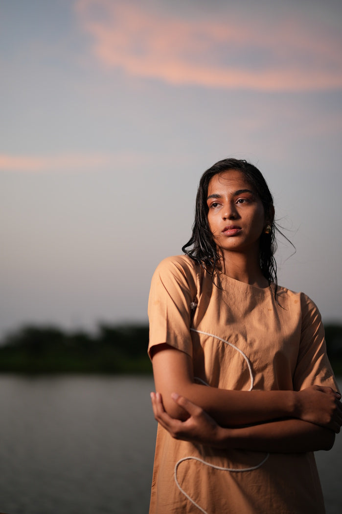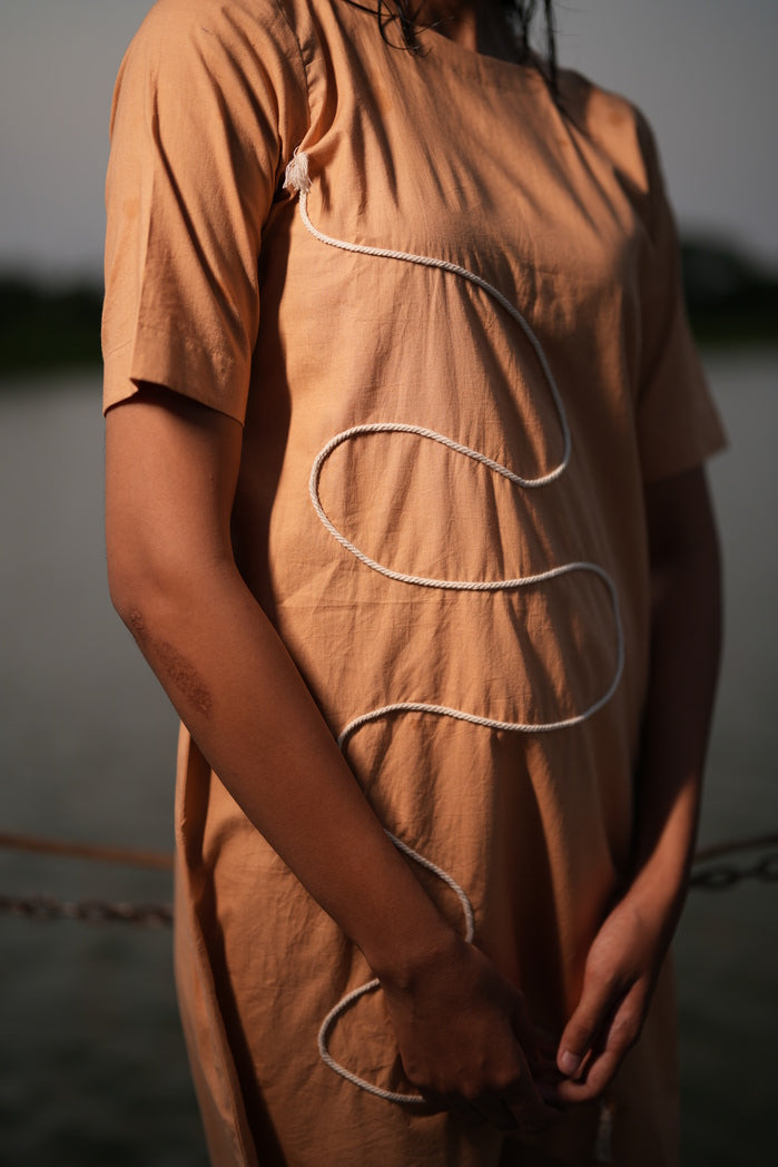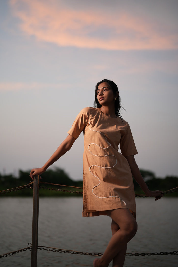 Effortlessly stylish and designed for all-day comfort, this short, loose-fitting shift dress is the perfect blend of casual and chic. With a relaxed silhouette, it allows for easy movement and breathability, making it an ideal choice for any occasion. The round neckline keeps the look simple and versatile, while the delicate wavy embroidery or piping in a light contrasting color adds a unique and decorative touch. This subtle yet stylish detail flows beautifully across the front, elevating the overall design.