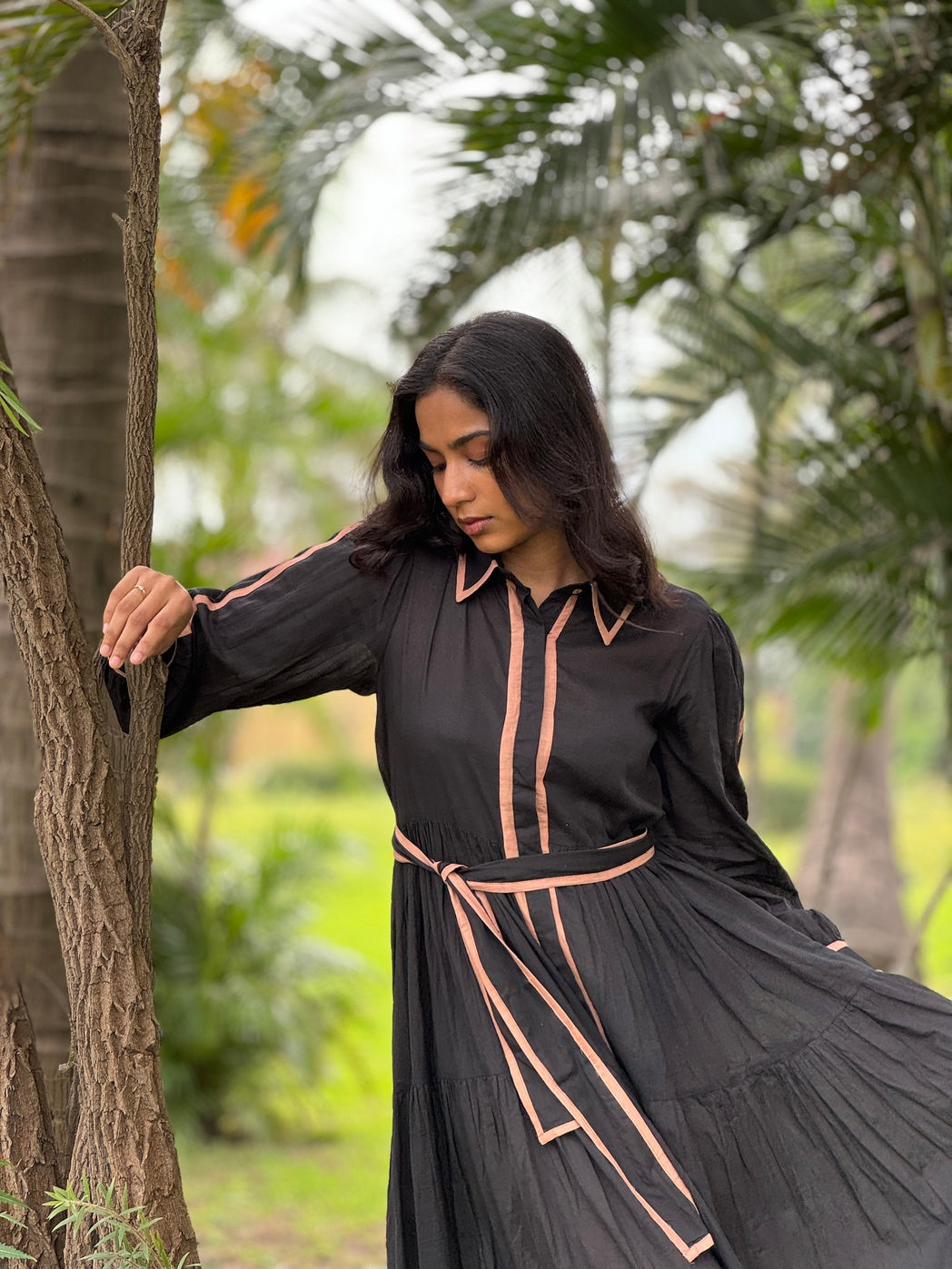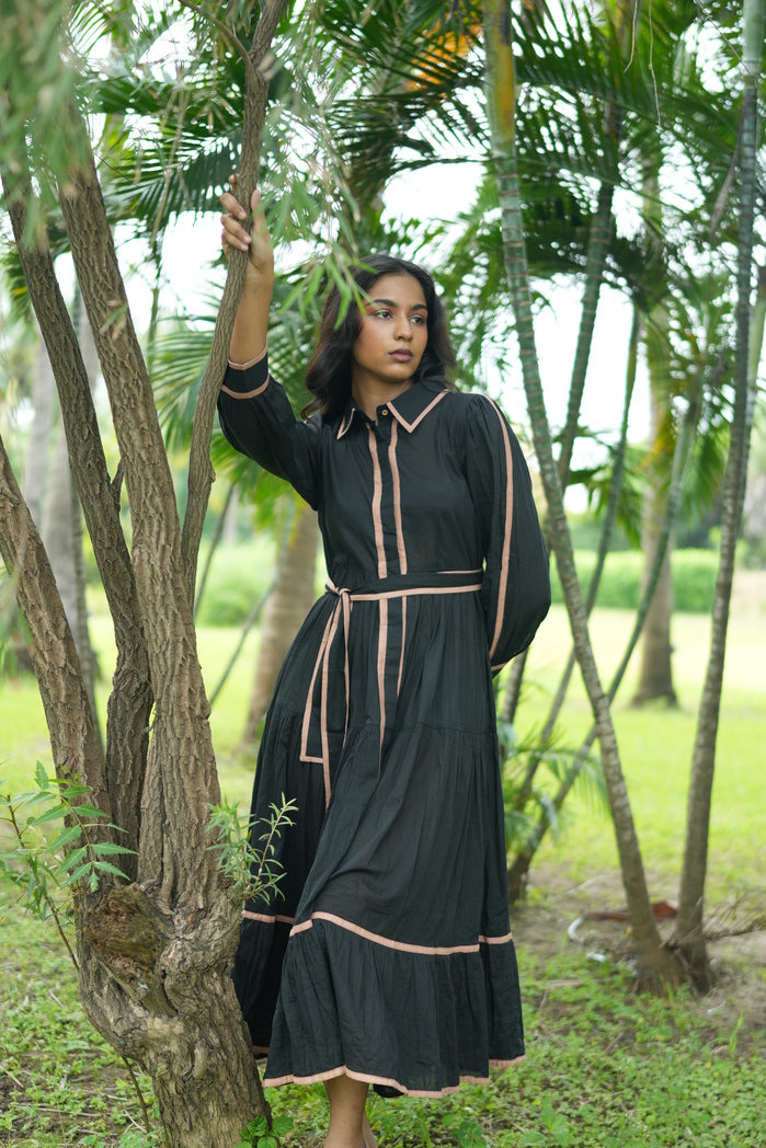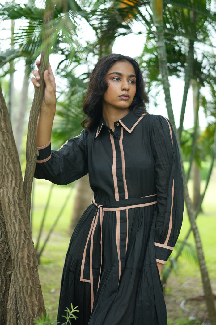 Effortlessly stylish, this black belted dress blends comfort with elegance. Featuring a collared neckline with delicate pink piping, long sleeves with subtle vertical stripes, and a matching fabric belt, it offers a polished, semi-formal look. Lightweight, breathable fabric ensures all-day wear, making it perfect for office or chic daytime occasions.