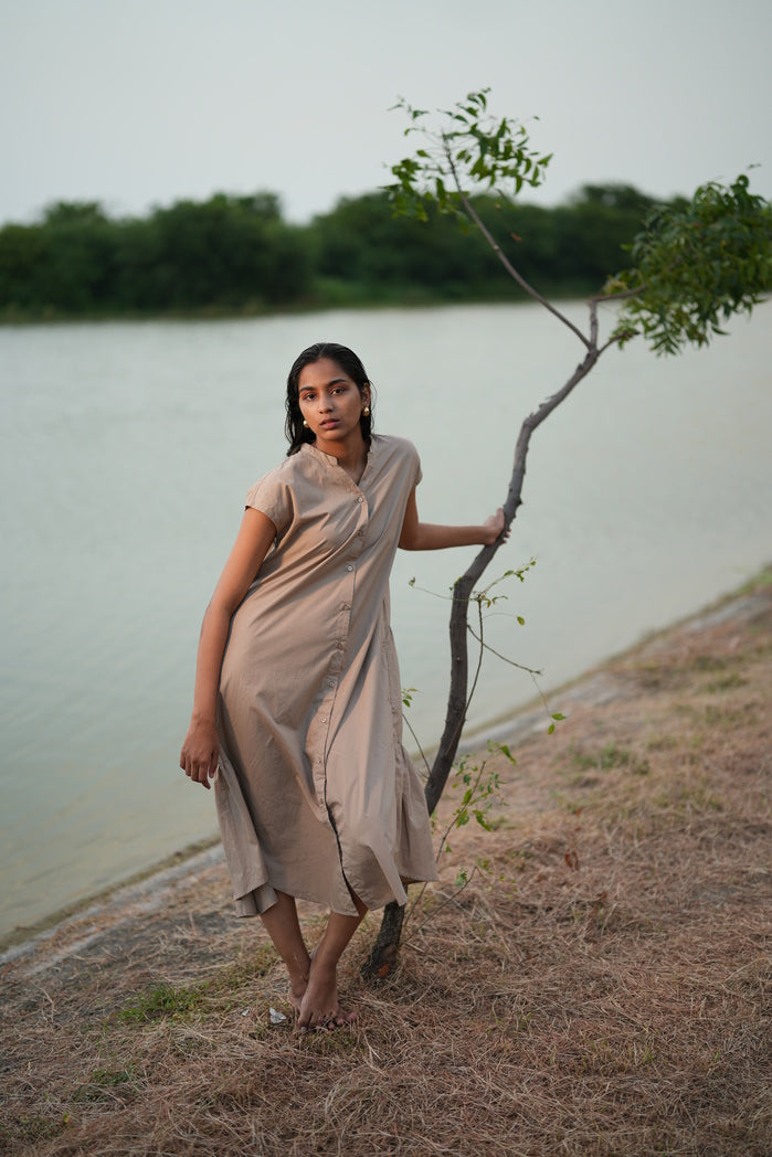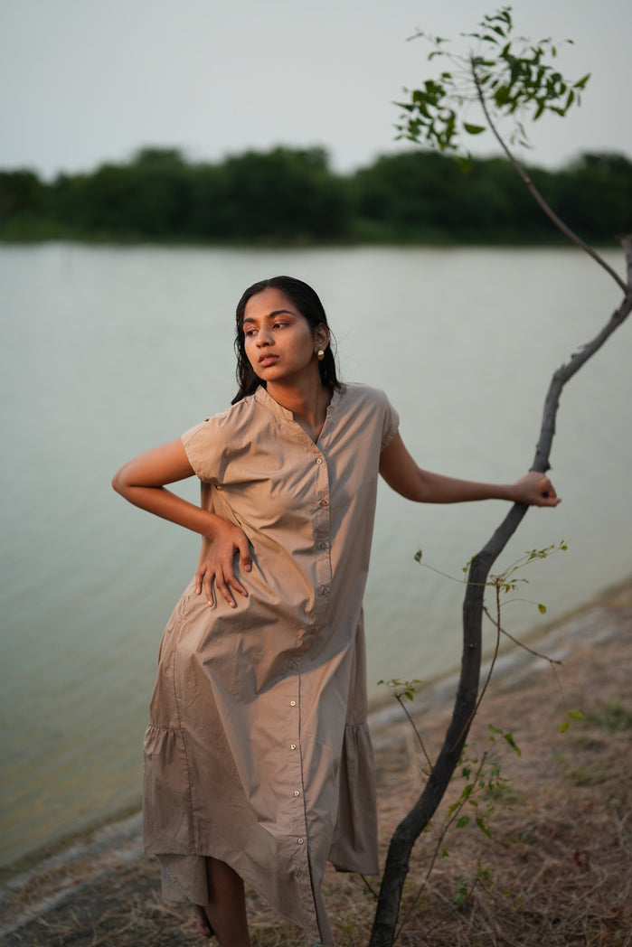 Effortless, chic, and comfortable, this beige-brown button-down dress features a loose, oversized fit and A-line silhouette for easy movement. Short sleeves and a classic button-front add timeless appeal. Crafted from lightweight, breathable fabric, it’s perfect for casual office days, weekends, travel, or as a versatile everyday wardrobe staple.