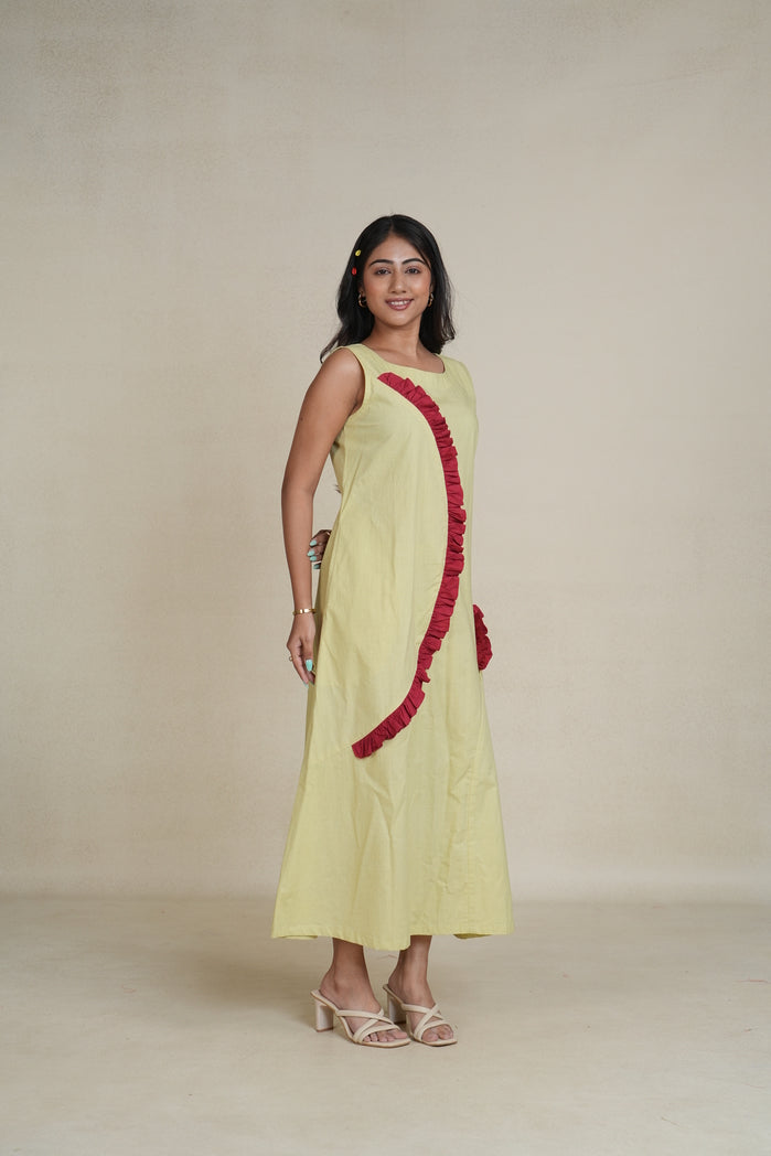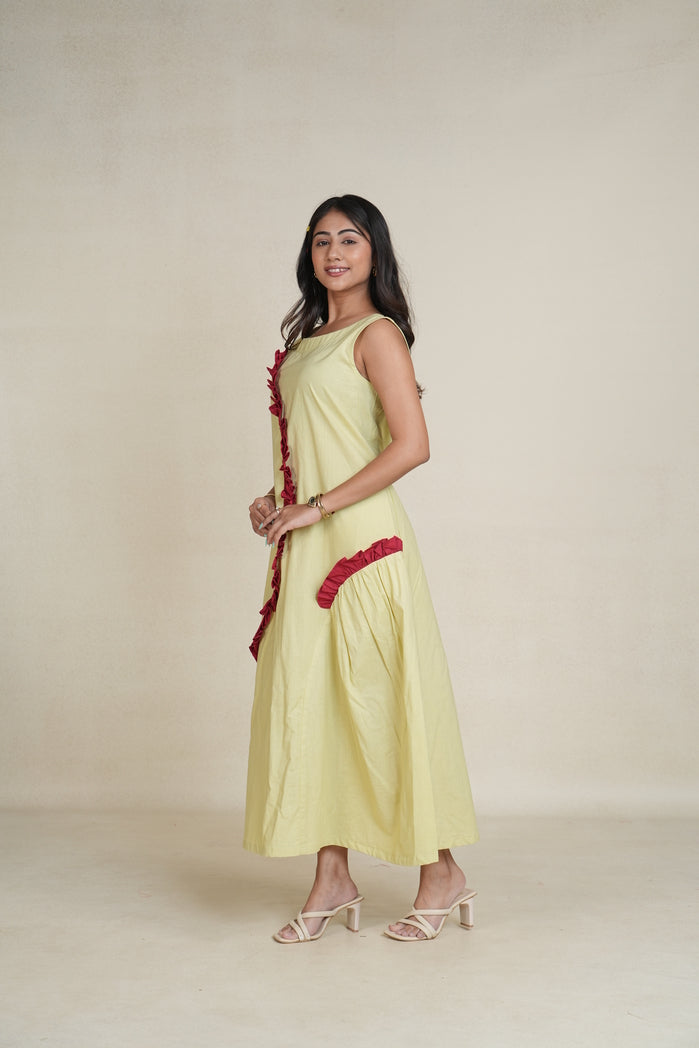 The Miass Dress from Trabea’s Golden Hour collection is a breezy, sleeveless dress in a soft pastel yellow, designed to offer both comfort and style. The dress is elevated with playful red ruffle details that curve across the front, adding a fun and dynamic touch. Perfect for summer days, casual outings, or vacations, this dress blends ease with a dash of elegance.