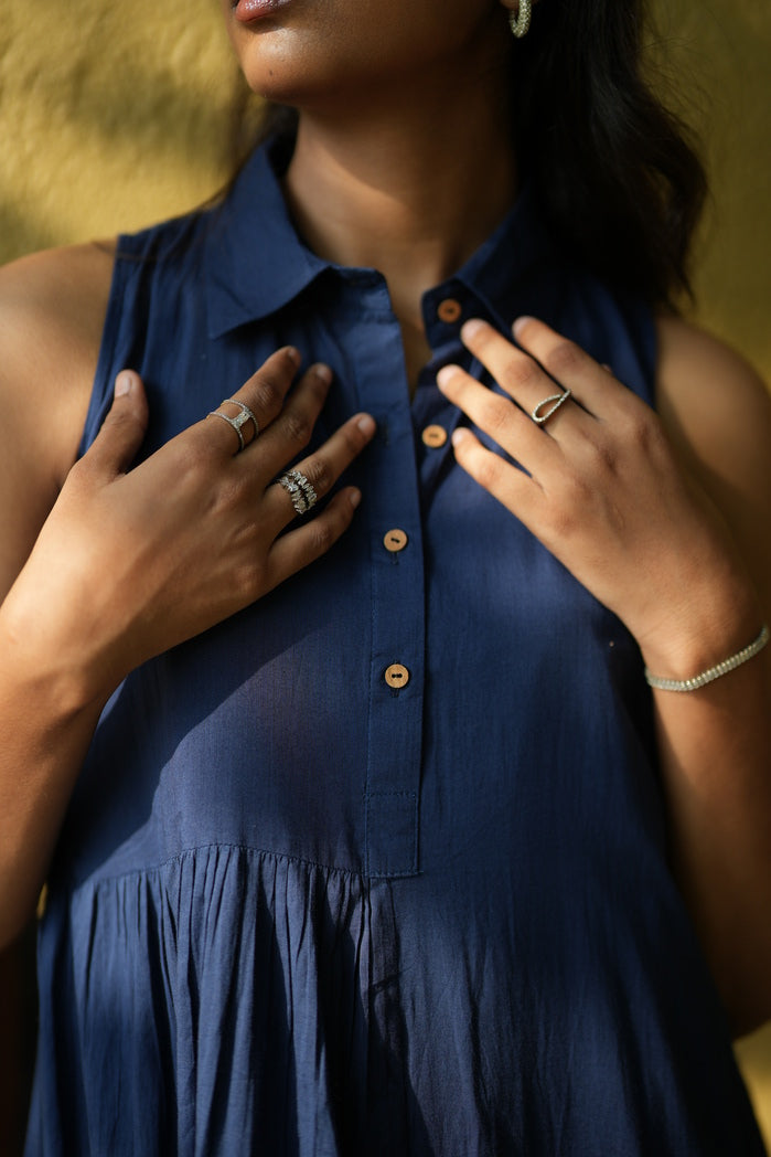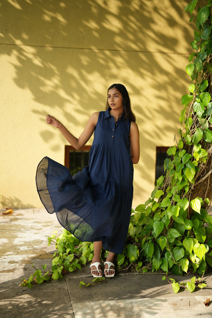 Effortless elegance meets comfort in this navy blue sleeveless maxi dress. Featuring a collared button-down bodice and a tiered, subtly gathered skirt, it offers graceful movement and a relaxed silhouette. Crafted from lightweight, breathable fabric, it’s perfect for warm days, casual outings, or semi-formal occasions. Pair with sandals or heels for versatile style.