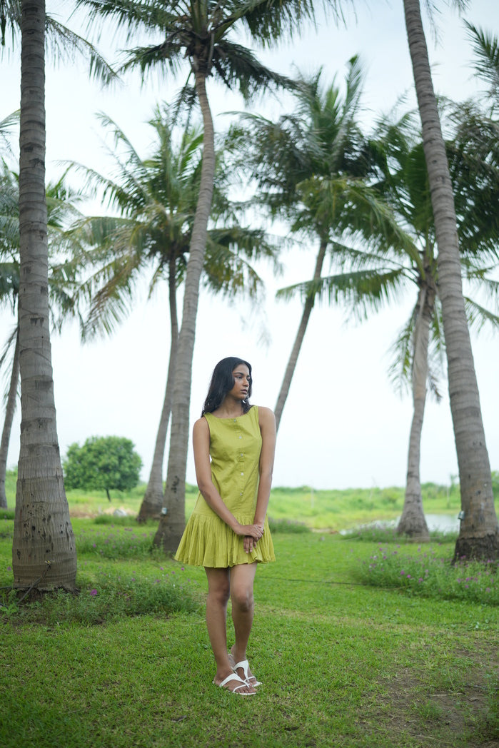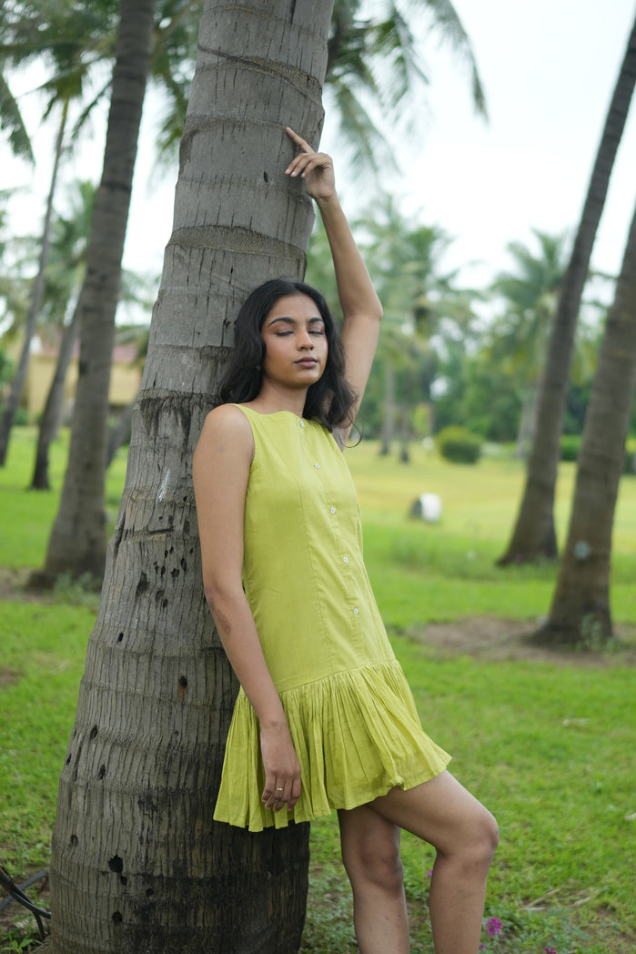 Bright and playful, this lime-green mini dress blends youthful charm with modern elegance. Sleeveless with a high rounded neckline and button-down front, it offers a structured yet casual look. The flared, pleated skirt adds movement and volume. Crafted from lightweight, breathable fabric, it’s perfect for brunches, summer outings, or vacations.