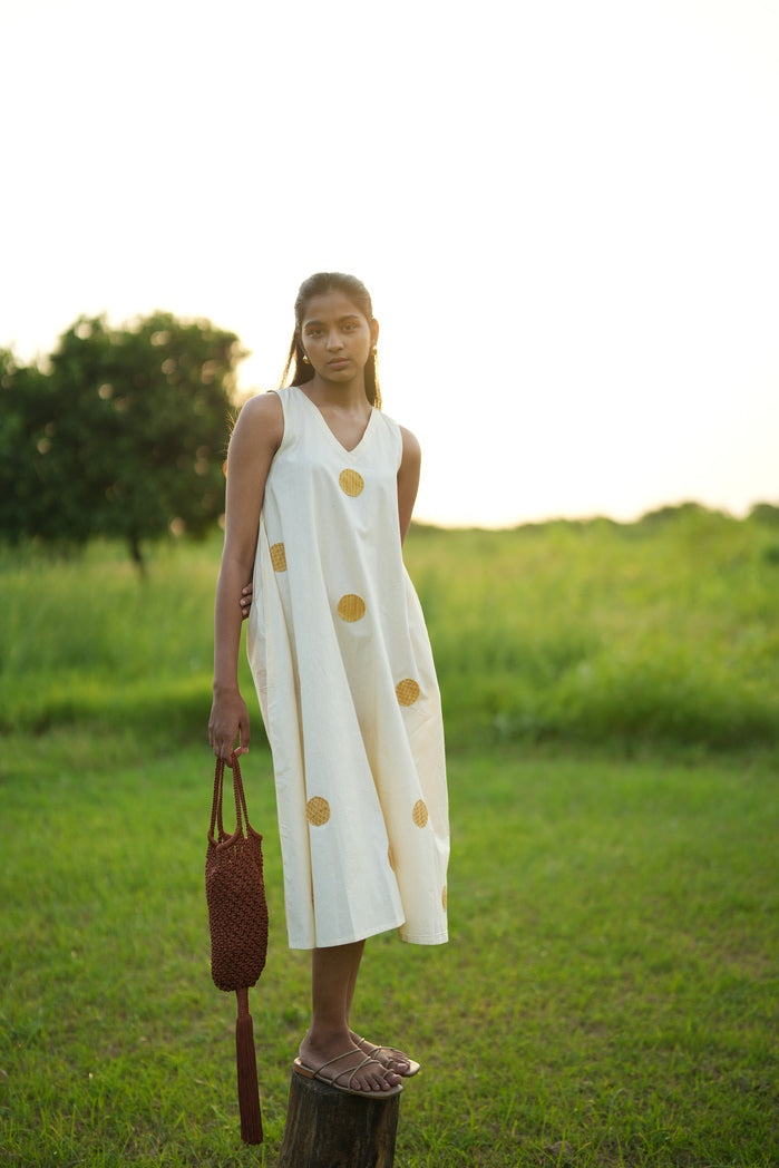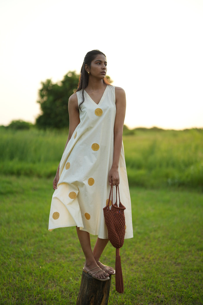 Light, breezy, and effortlessly stylish—the Palermo Flowy Dress is designed for sunny days. This sleeveless white midi dress features a relaxed, flared silhouette that moves with ease. The highlight? Golden circular prints that add a subtle yet playful elegance, making this dress feel both modern and timeless. Crafted from lightweight fabric, this dress is perfect for summer outings, vacation looks, or casual chic styling. Whether you're searching for a white and gold midi dress, a breezy summer dress, or a sophisticated yet simple piece, this one is an easy wardrobe essential!