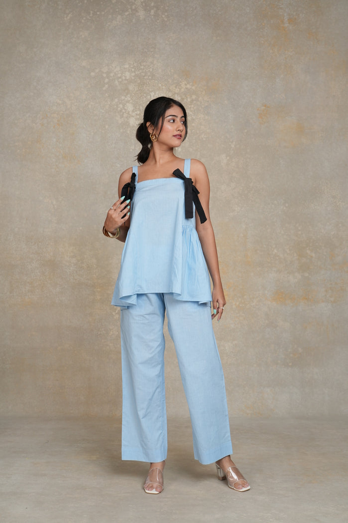 The Thames Set from Trabea’s Golden Hour collection is a light blue co-ord set that offers a relaxed and comfortable fit. Featuring cute black bows on both sides, this set adds a playful touch to the minimalist design. Paired with matching light blue pants and crafted from breathable fabric, it’s the perfect outfit for casual outings, weekend gatherings, or laid-back summer days.