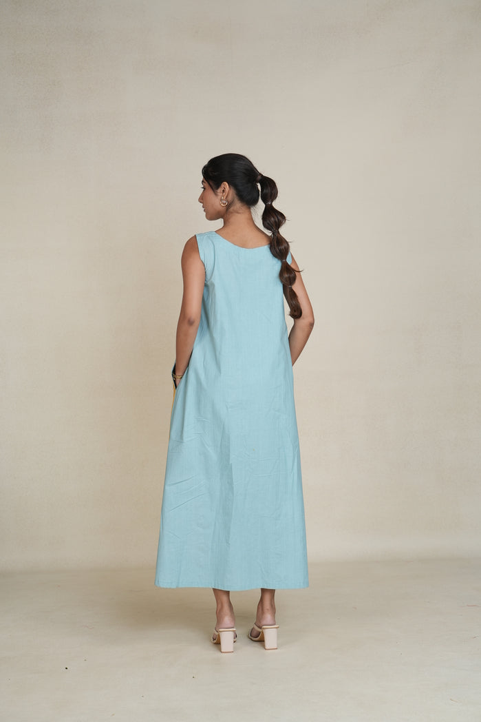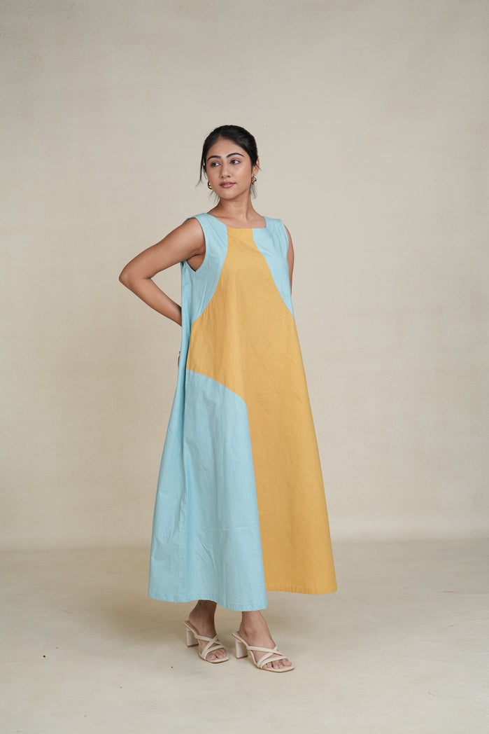 The Tunis Dress from Trabea’s Golden Hour collection is a refreshing ice blue, mid-length dress elevated with a striking mustard pattern at the center. Sleeveless and crafted from breathable fabric, it offers all-day comfort and effortless elegance. This summer dress for women is perfect for warm-weather outings, vacations, casual office days, or stylish everyday wear.