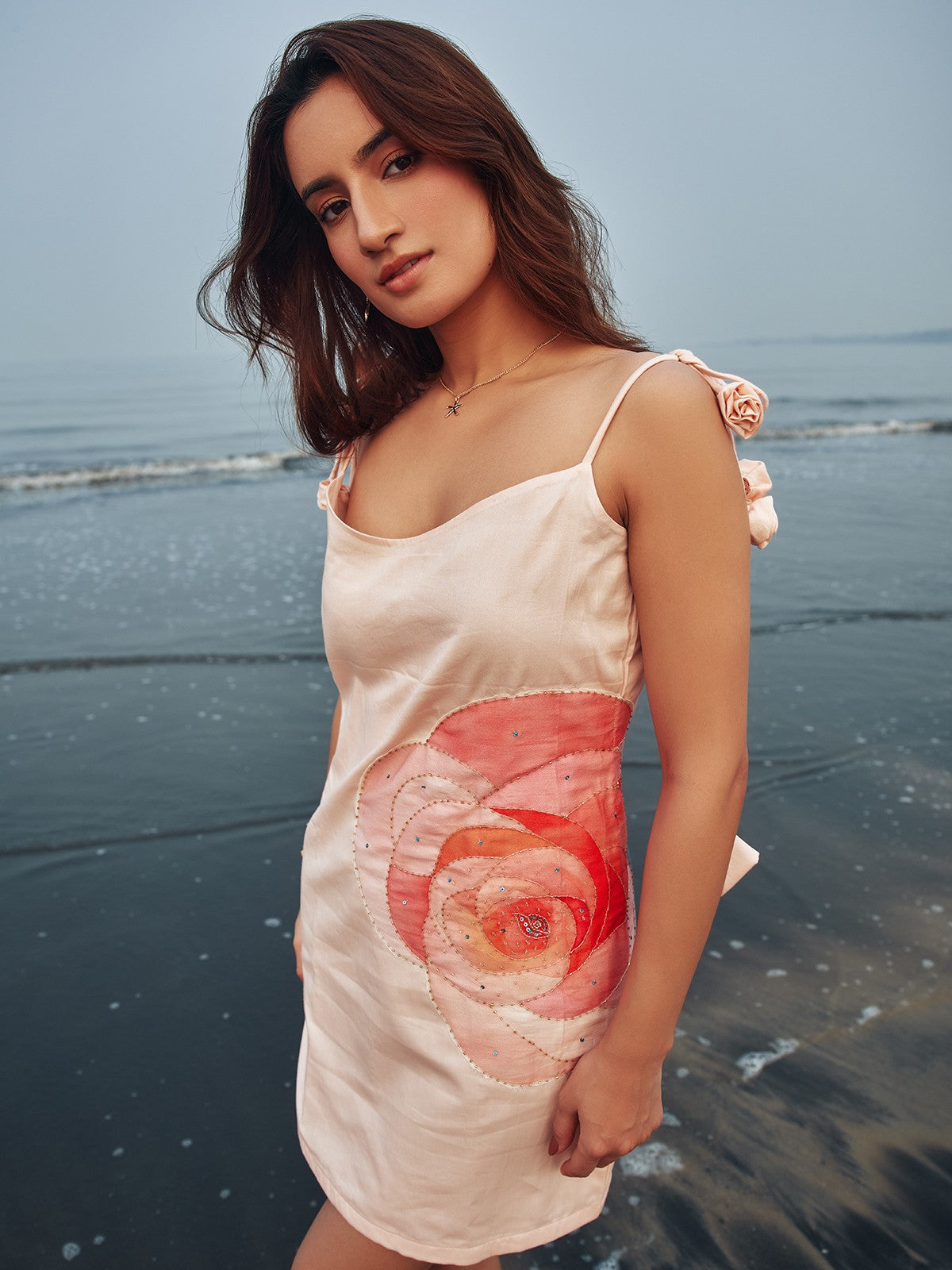 Graceful, feminine, and undeniably striking this romantic dress is crafted in a luxurious cotton satin blend that glides effortlessly with every step. The highlight? A bold statement rose patch blooming at the side, paired with delicate handcrafted roses adorning on all tie up strings. Designed for days when you want to feel soft yet standout.