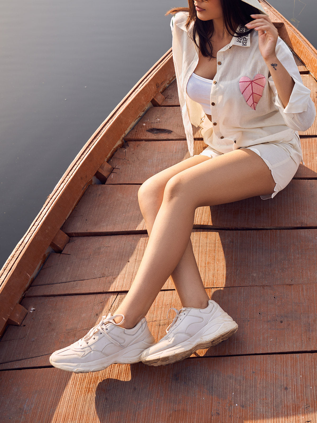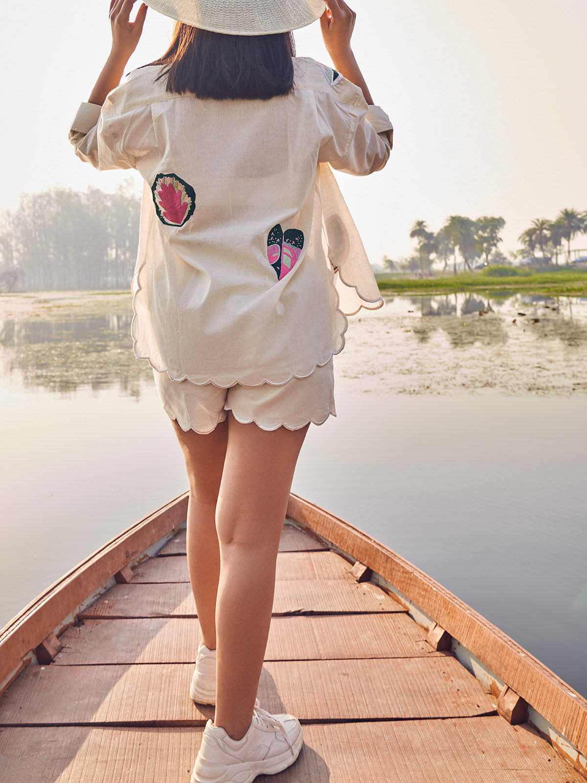 A co-ord which is never not comfy, with exotic tropical leaves embroidered all over, hand made in the perfect shade of white and not to miss the showstopper detailing of the scallops at the ends. This Bombshell oversized shirt, bringing together our love for natural fabrics, handcrafted details, styles and the summer whites.