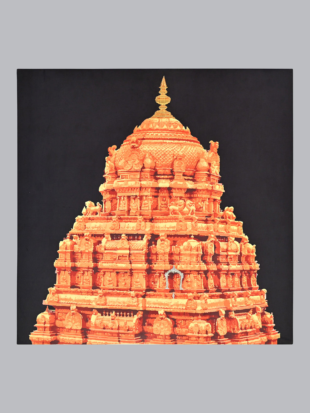 Enter the realm of divine beauty with 'Ananda Nilayam,' a masterpiece from Underlyn. This artwork magnificently portrays the golden gopuram of Tirumala temple in Tirupati, India, inspired by the sacred Ananda Nilayam. Printed on soft velour fabric, it features intricate silver zardozi work highlighting the Vimana Venkateswara's position. This delicate embroidery enriches the artwork's texture, offering a lifelike depiction of spiritual elegance. Let 'Ananda Nilayam' grace your space with its divine charm, celebrating the Abode of Happiness and infusing your home with spiritual splendor.