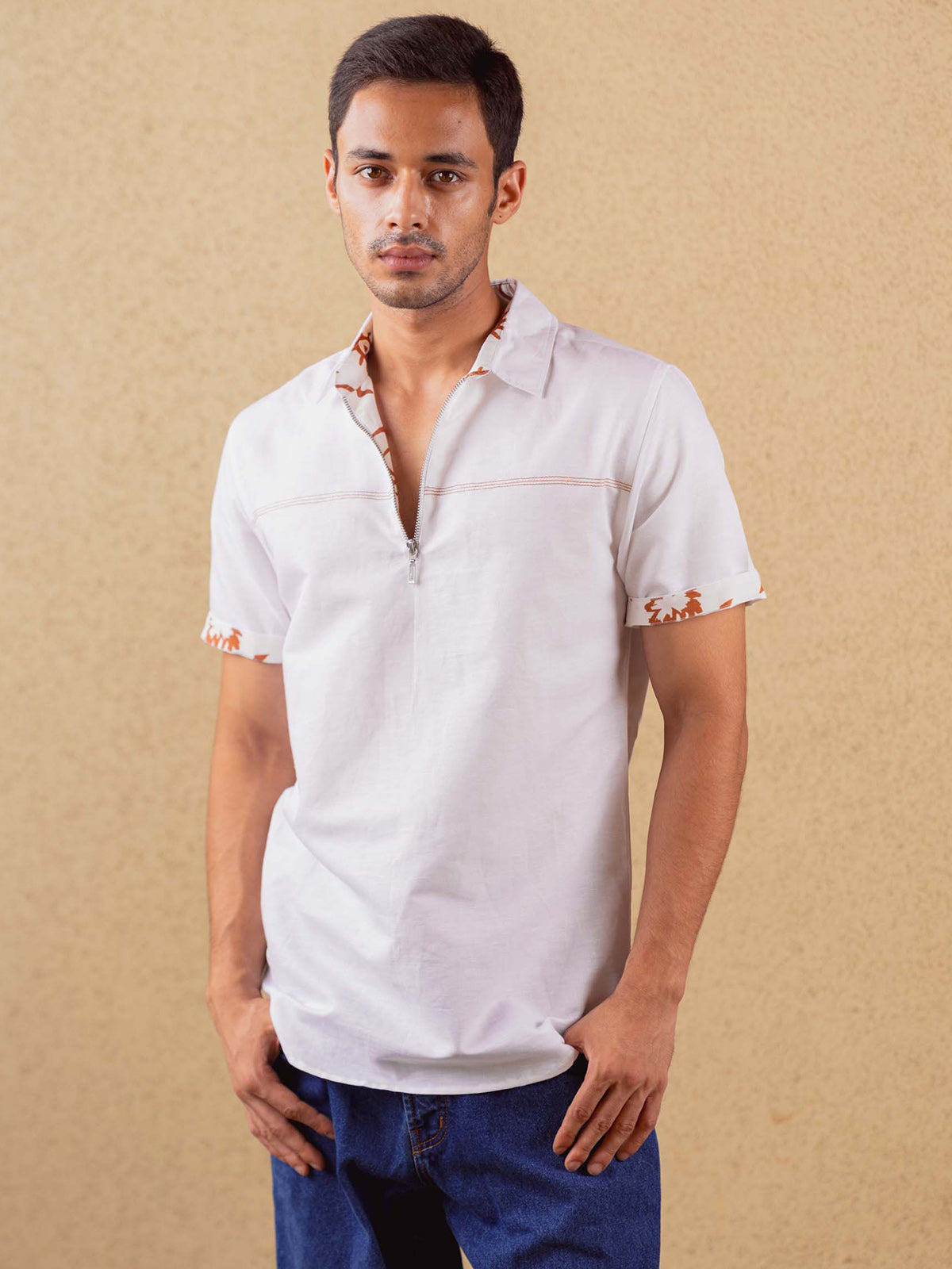 The Bounty Shirt blends classic style with a contemporary edge, perfect for casual hangouts and semi-formal events. Featuring a modern zipper at the collar and distinctive thread lines across the chest, this shirt adds a fresh, textured look to its timeless design.