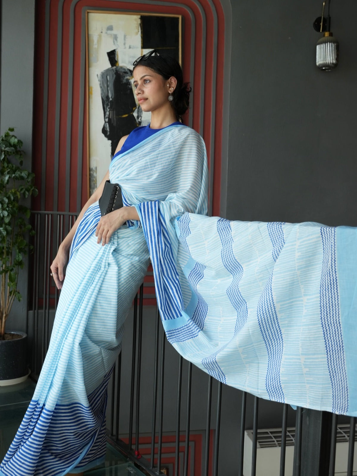 Navya Heritage Hand Block Printed Pure Cotton Striped Saree