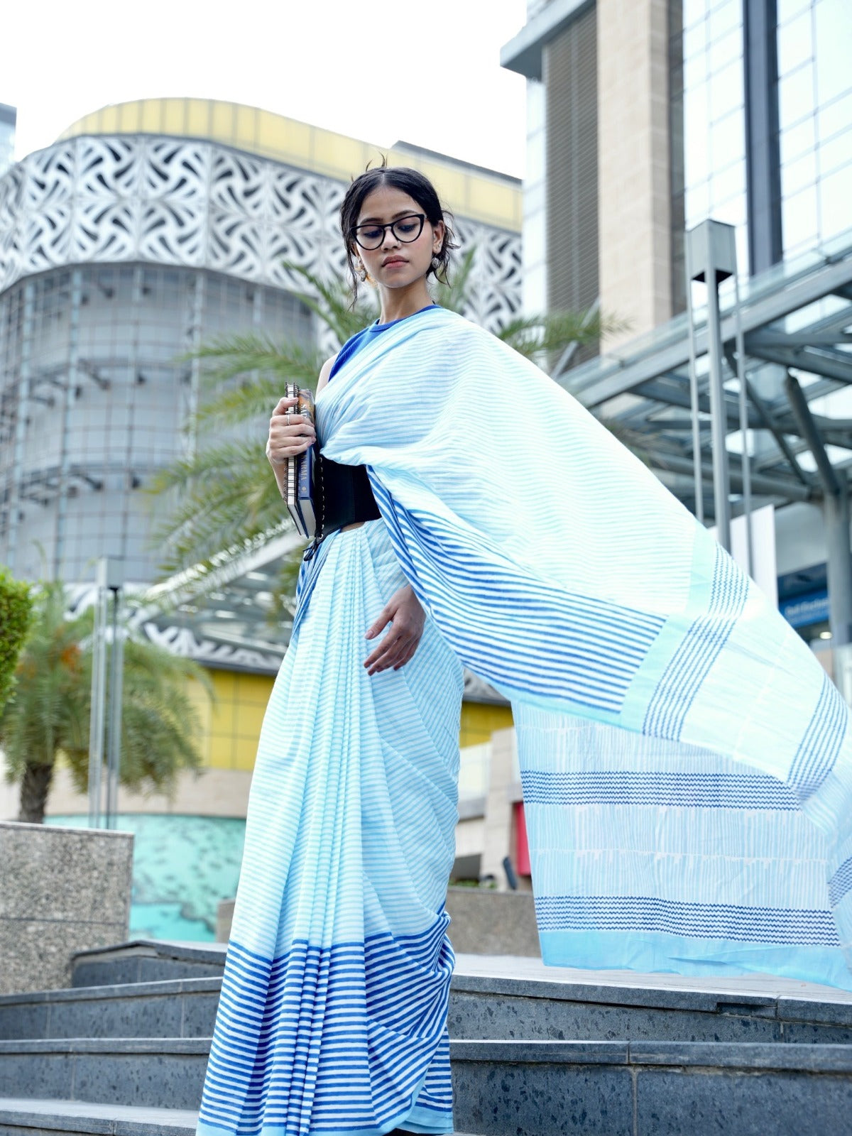 This pure-cotton saree is hand block printed by Jaipur’s National Award-Winning artisans using natural dyes and traditional processes. The airy drape and classic stripes offer understated elegance—an ode to heritage crafts, thoughtfully reimagined for modern dressing.