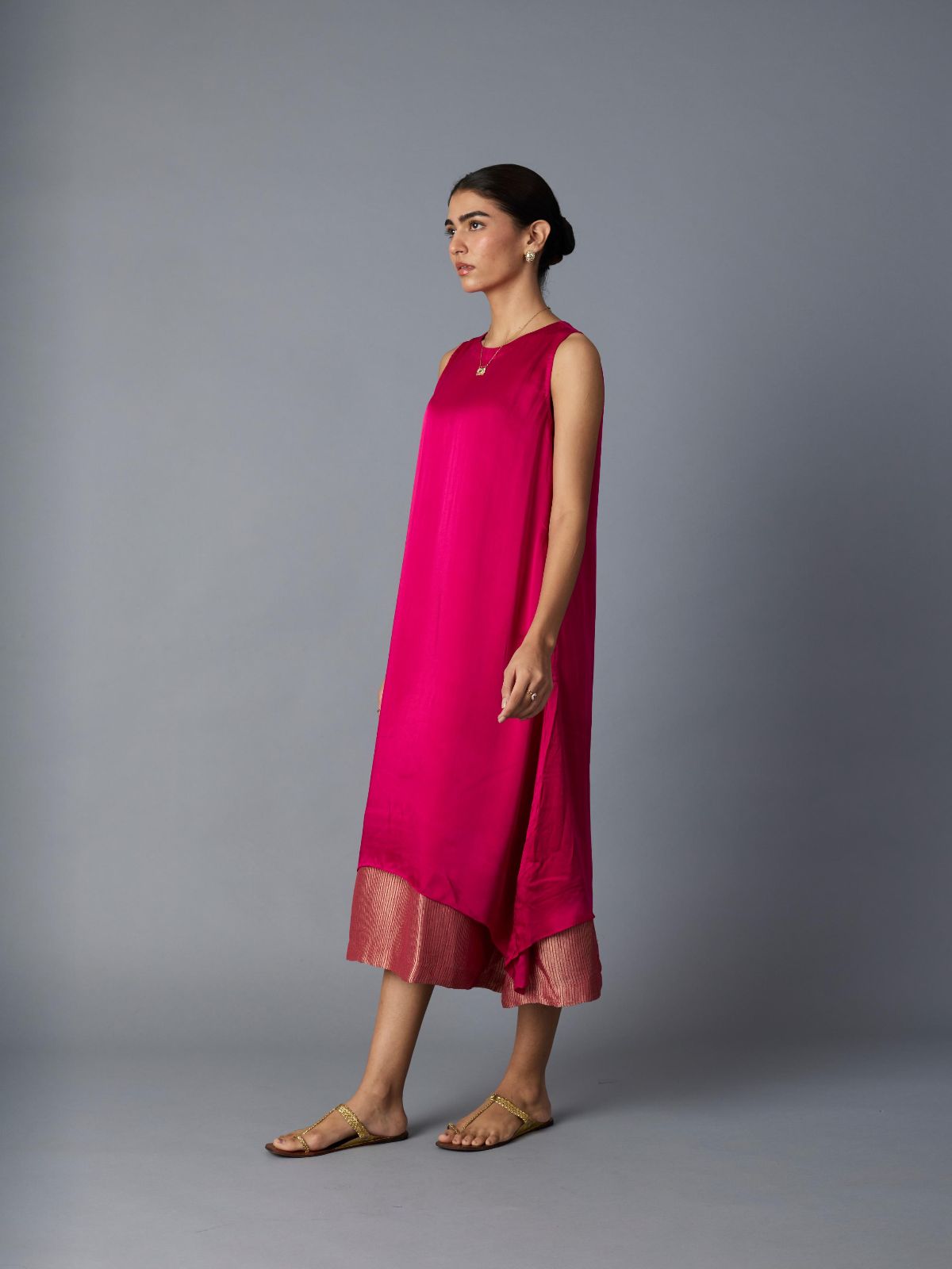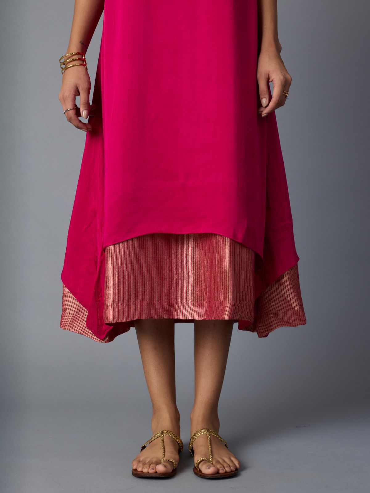 This elegant halter-neck dress features an intricate zari-striped foundation that imparts a sophisticated luminescence. A tasteful keyhole cutout at the rear introduces understated visual interest while maintaining refined sensibility. The silhouette balances fluid draping with structural integrity, delivering both grace and wearability. Ideal for festive celebrations, formal evening affairs, and special occasions where polished sophistication is desired.