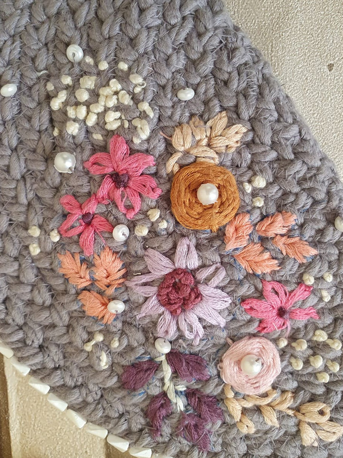 This is a handcrafted semicircular embroidered purse in a soft gray hue, adorned with delicate hand embroidery featuring floral motifs in pastel shades of pink, peach, lilac, and ivory. Accented with pearl beads and finished with a colorful tassel and decorative latkans, it exudes a charming, artisanal appeal perfect for ethnic or boho-chic styling.