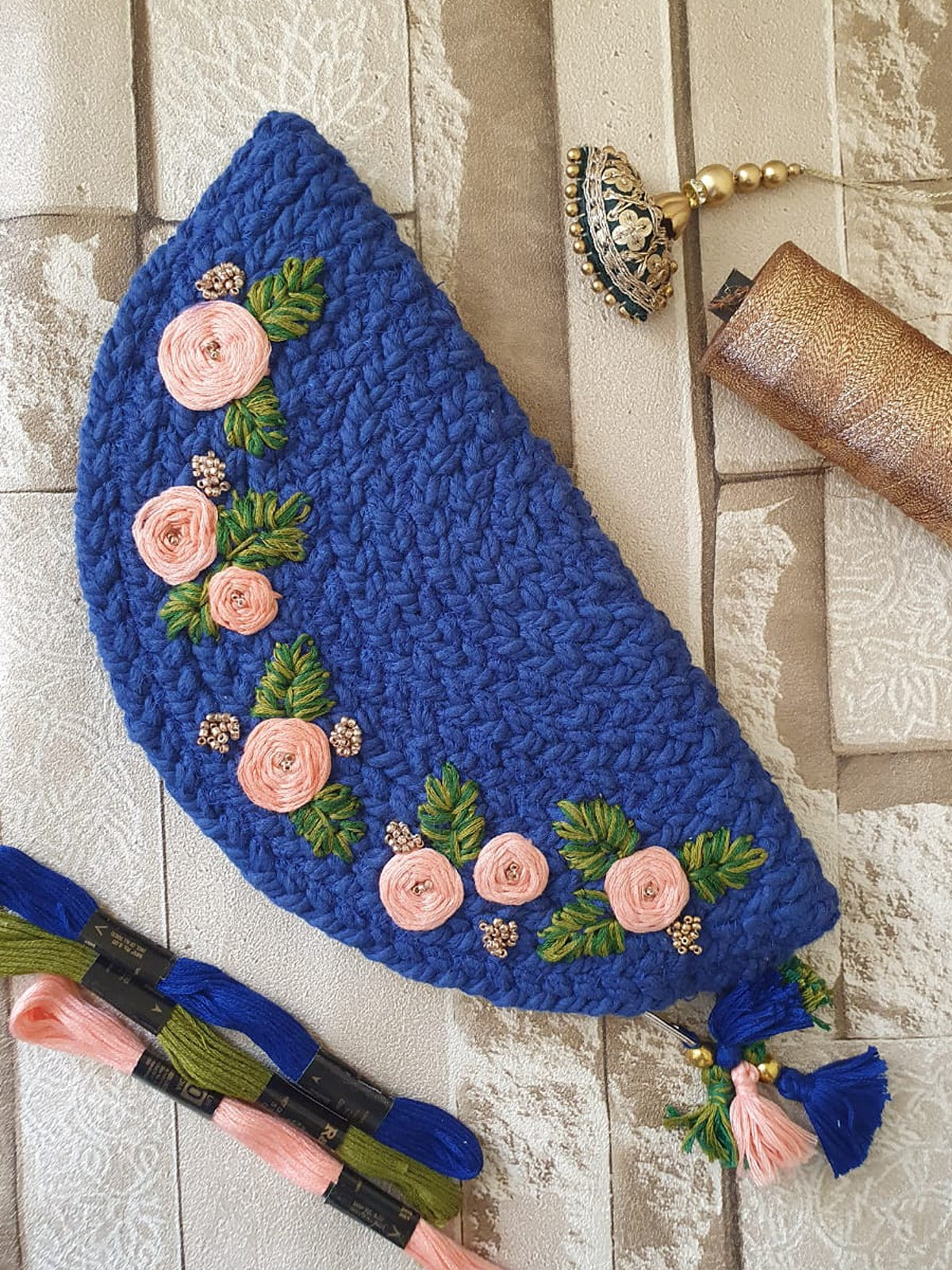 This elegant purse is crafted with intricate dori and thread embroidery, showcasing exquisite craftsmanship and traditional artistry. The design features beautifully interwoven patterns, meticulously embroidered with fine silken threads and dori work, creating a rich and textured surface.