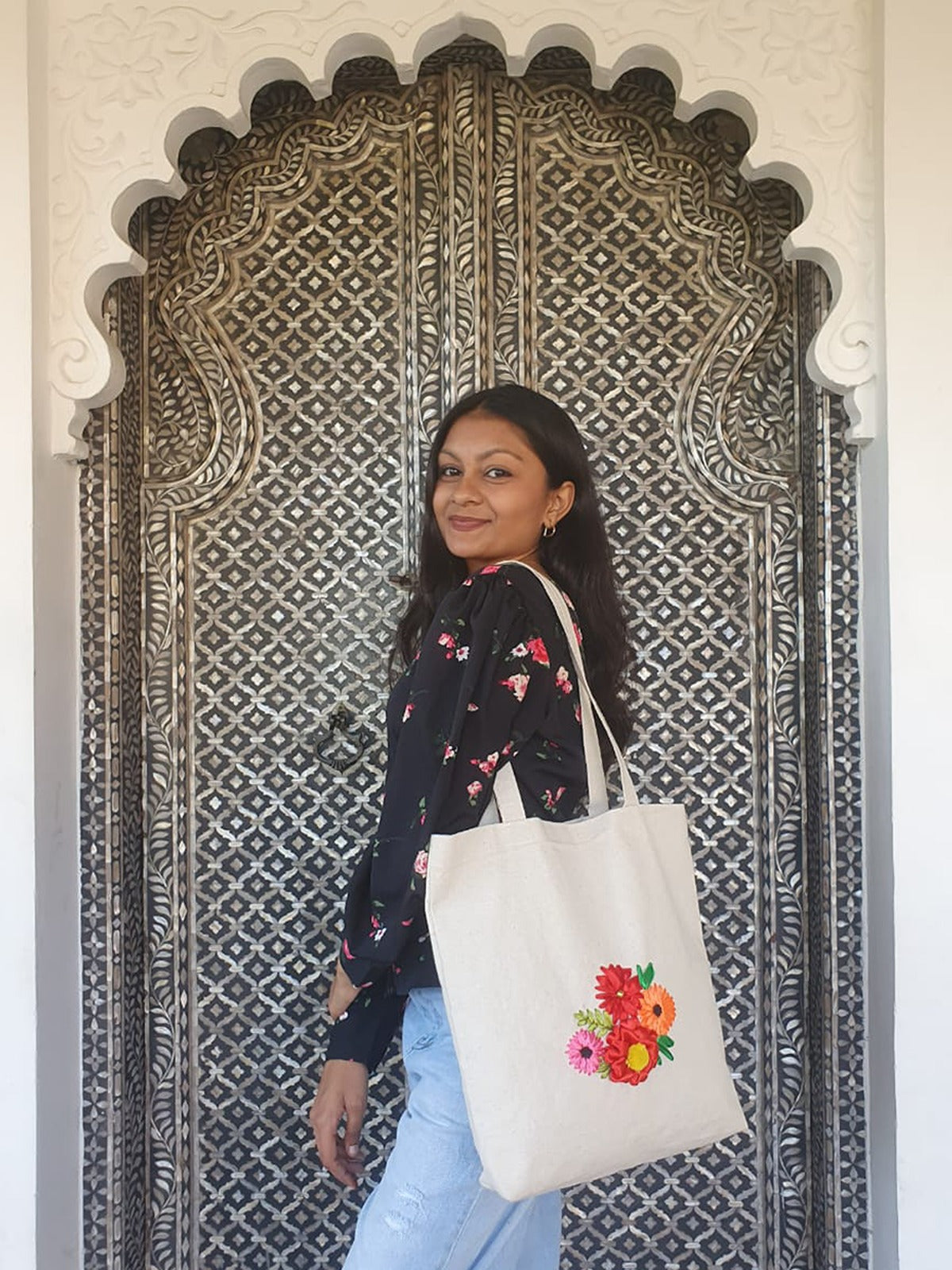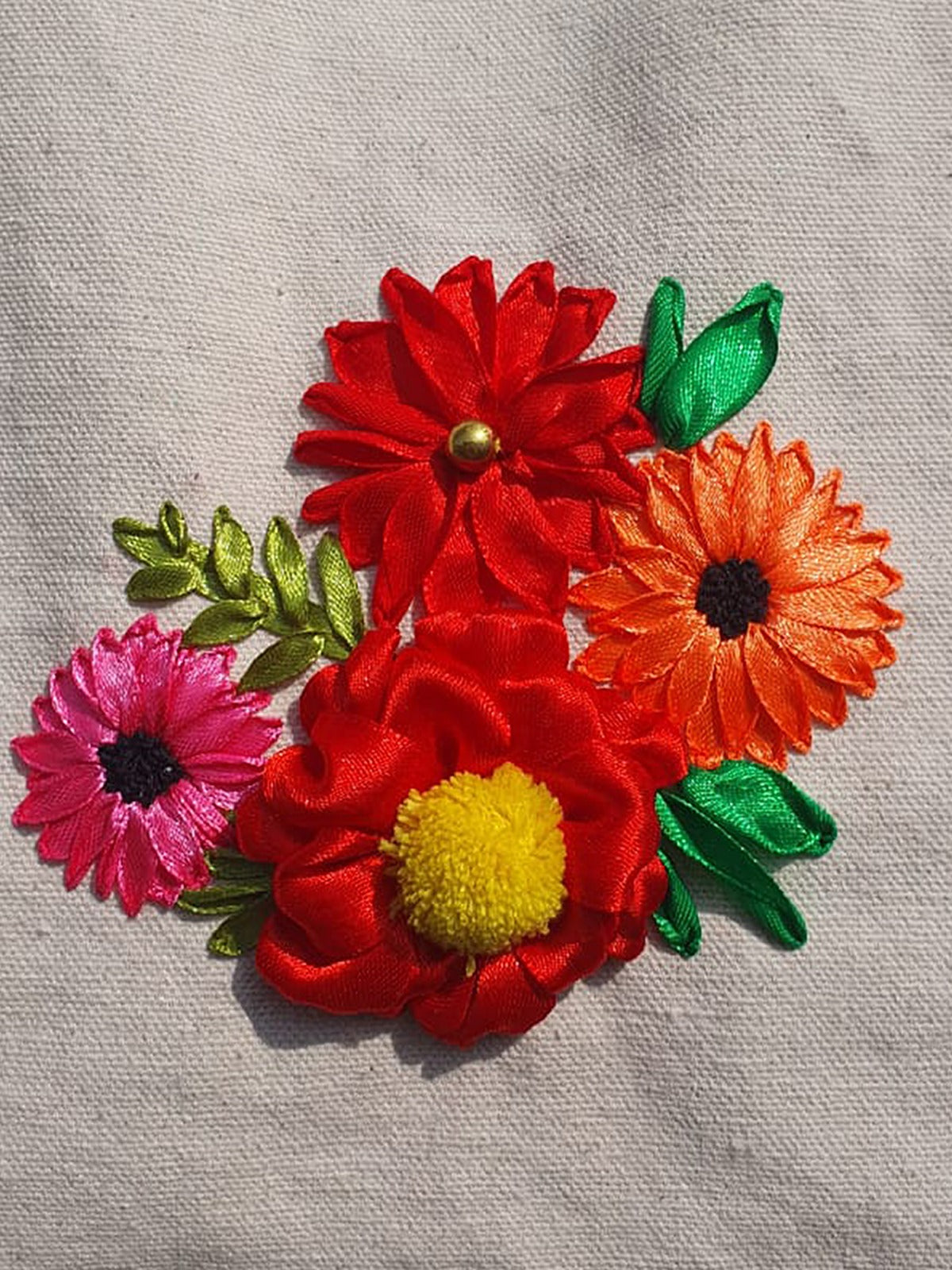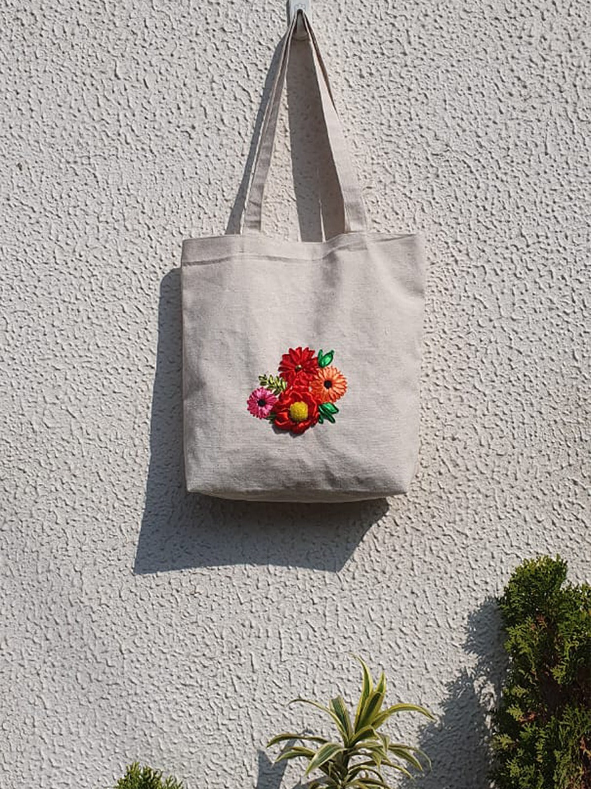 This is a natural off-white canvas tote bag featuring vibrant hand-embroidered floral motifs in shades of red, pink, and yellow. Spacious and eco-friendly, it's perfect for casual outings, shopping, or everyday essentials.