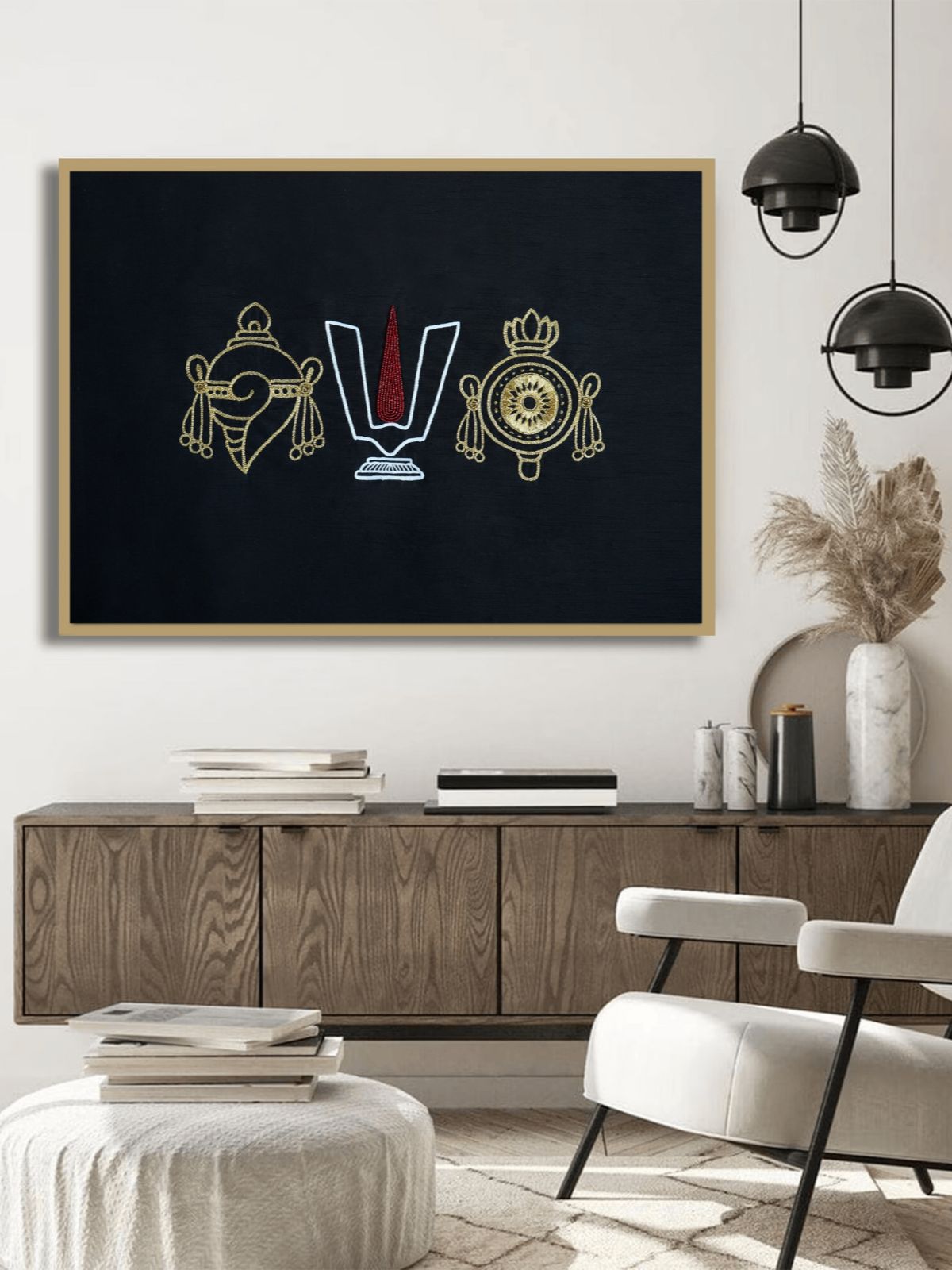 The Divine Lord Venkateswara Wall Art is a contemporary tribute to one of Vishnu’s most revered forms — the guardian of faith and bestower of prosperity. His divine essence is expressed through three sacred emblems: the shankha, tilak, and Sudarshan Chakra, symbolizing purity, devotion, and cosmic protection. Handcrafted on rich raw silk with fine aari embroidery and delicate beadwork, this vertical piece exudes quiet strength and refinement. Perfect for living rooms or temple corners, it brings an aura of serenity and blessings — devotion reimagined through modern artistry.