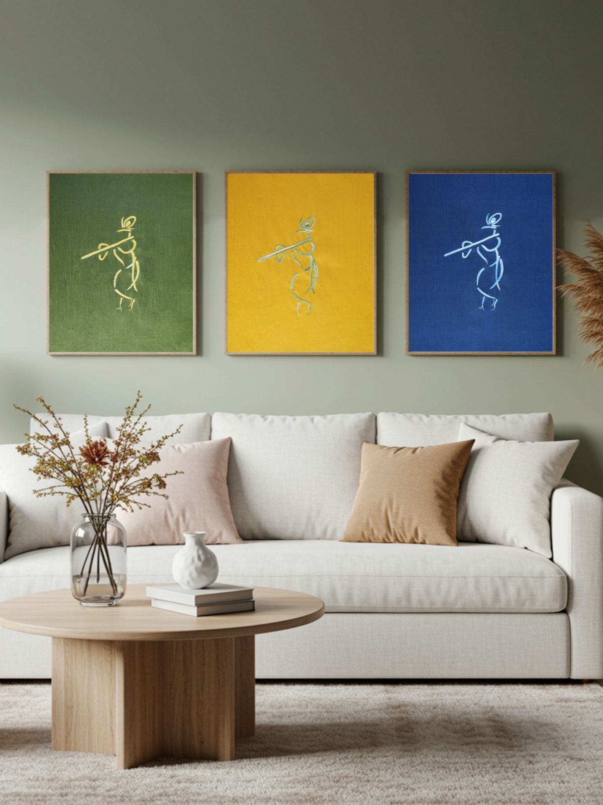 A seamless blend of devotion and design, this artwork reimagines Lord Krishna in a contemporary artistic form. Inspired by the eternal image of Krishna with his flute, it captures a sense of calm, harmony, and grace. Handcrafted on lustrous raw silk with intricate aari embroidery, the piece features ombre threads that create depth, movement, and vibrancy. Elegant yet soulful, it embodies both tradition and modern artistry — a timeless accent for living rooms or devotional spaces, radiating serenity and divine charm.
