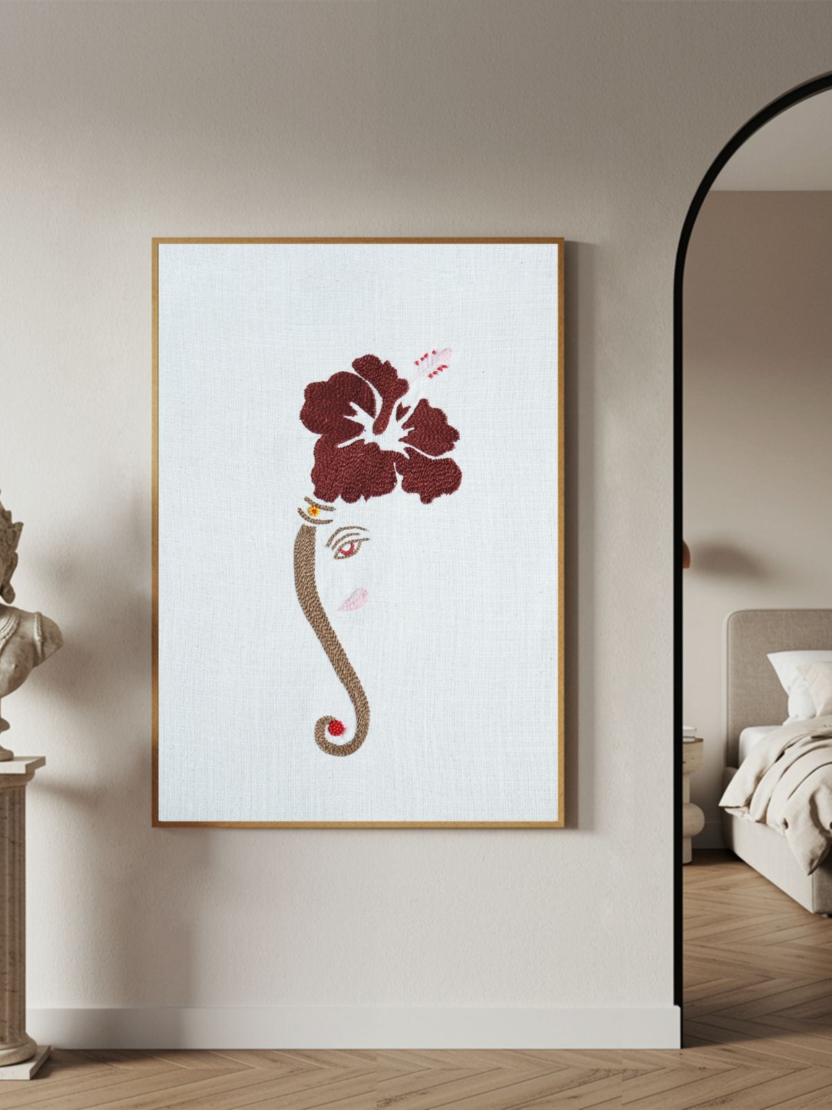 The Gajavakra artwork reimagines the sacred act of offering a hibiscus to Lord Ganesha — a gesture of purity and devotion. Hand-embroidered on fine cotton using the timeless aari technique, it blends traditional symbolism with contemporary minimalism. The interplay of the elephant’s trunk and the flower captures strength in serenity. Subtle, soulful, and refined, it’s a versatile accent that brings auspicious energy and grace to any space.