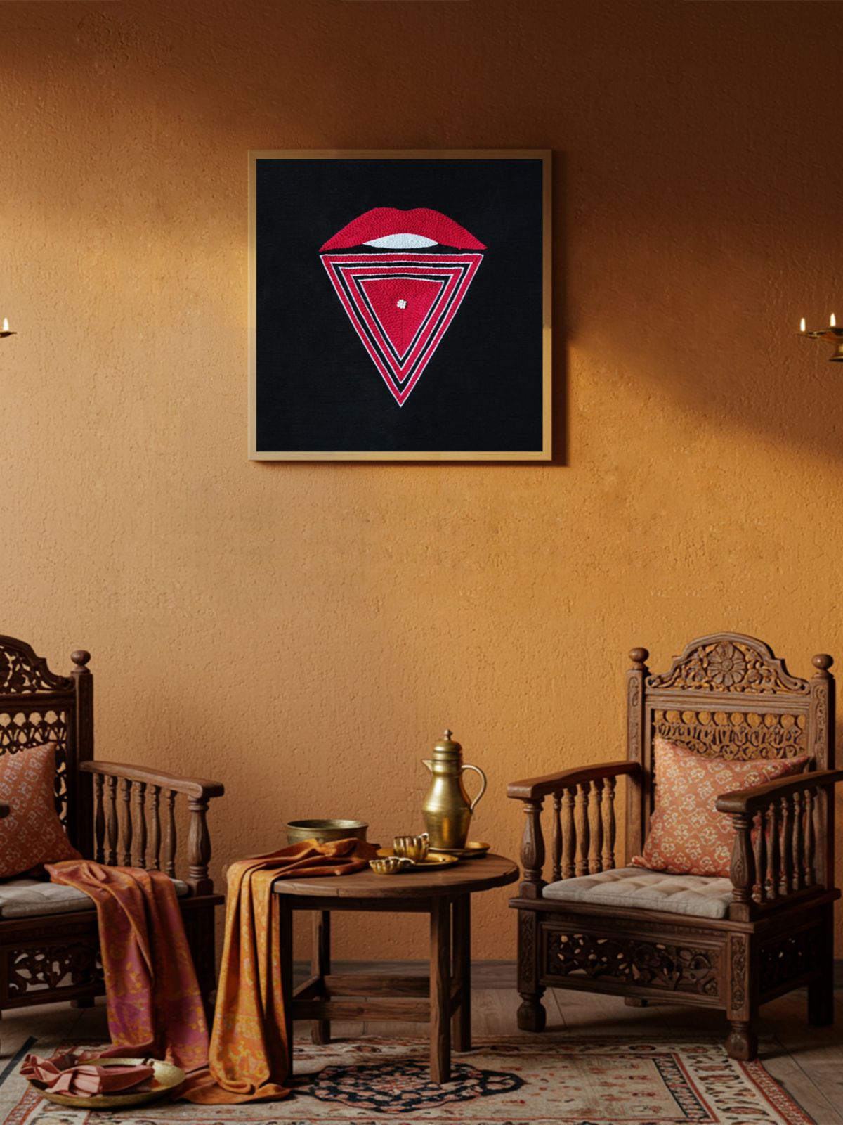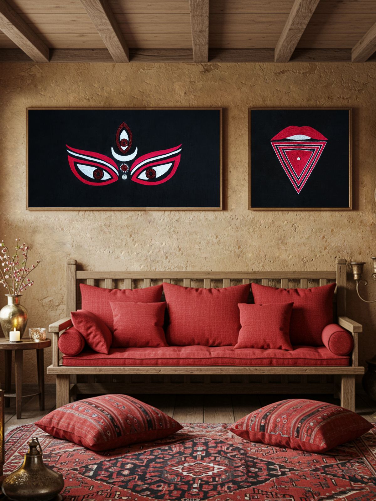 Bold and powerful, this artwork captures the iconic image of Goddess Kaali with her protruding tongue — a symbol of truth, fearlessness, and the dissolution of negativity. Meticulously handcrafted with aari embroidery and subtle bead highlights, it blends intensity with elegance. More than décor, it is a protector of spaces — bringing divine energy, strength, and clarity to your home with contemporary sophistication.