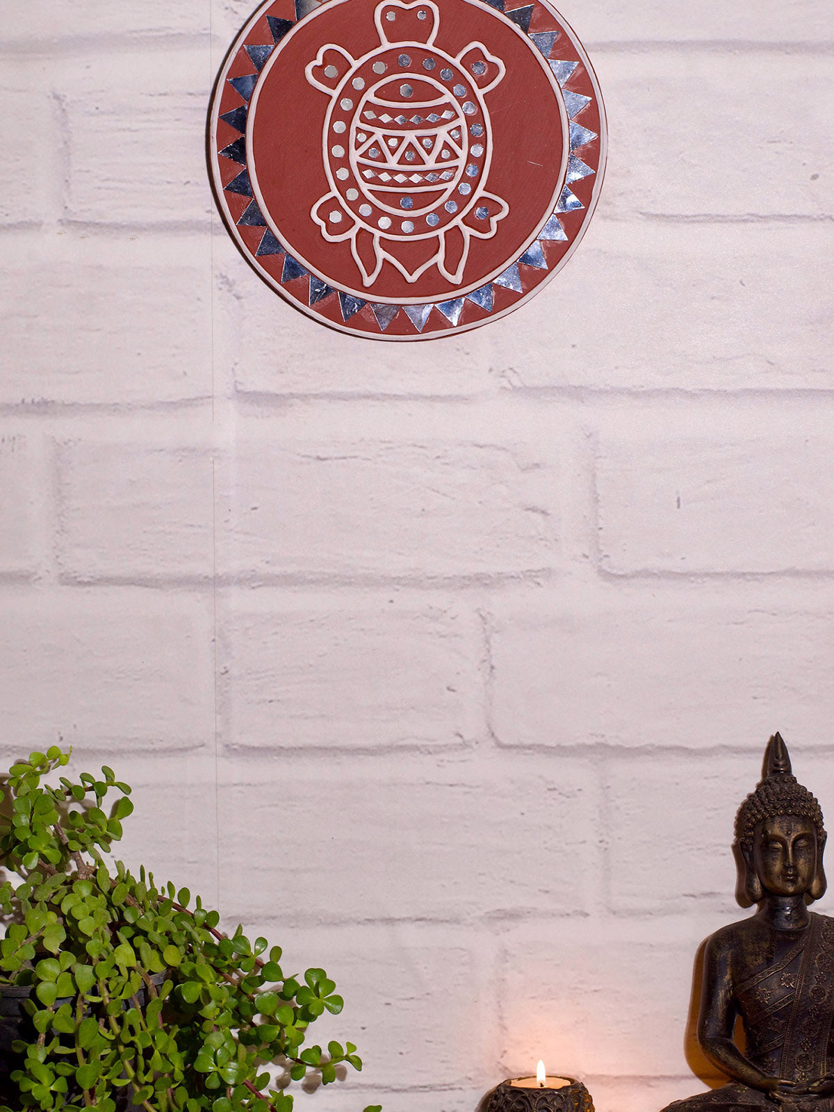 Discover the exquisite beauty of this mud-work wall plate, crafted in one of the clusters in Kutch. Through the cold-ceramic process, clay is carefully applied to a wooden board, dried, painted, and then adorned with mirrors. Traditionally, mud art was used to decorate homes, walls, windows, furniture, and various objects. The tortoise, a symbol of wisdom and knowledge, imparts its virtues to this stunning piece. Enhance your knowledge and find guidance on the right path with this beautiful wall plate. Adorn your entryway, temple room, or any wall in your house by hanging it alongside other design options and colors for a complete and harmonious look.