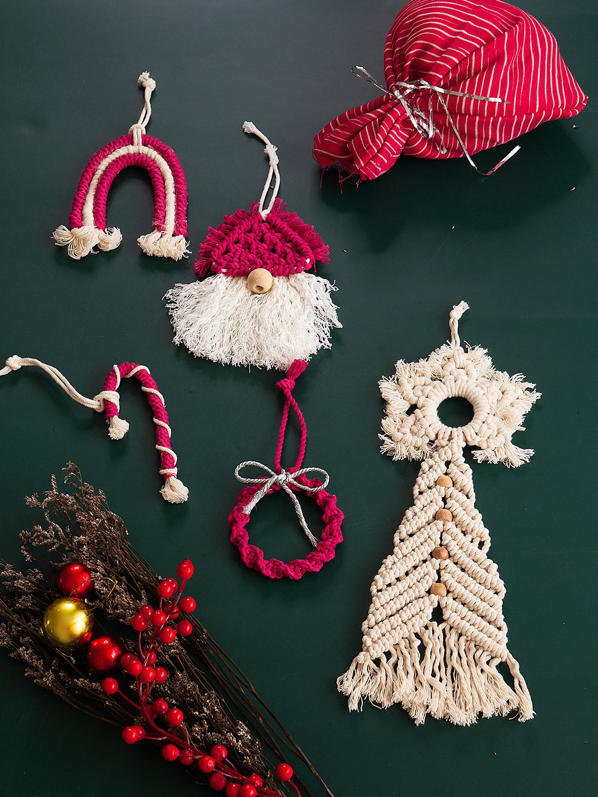 Add a festive flourish to your holiday decor with these Handmade Macrame Christmas Ornaments! These charming adornments are perfect for your Christmas tree, also serving as delightful gifts for friends and family. Crafted from Natural Pure Cotton Cord, the set includes a variety of 5 ornaments - Gnome, Christmas tree with Star, Rainbow, Candy cane, and Wreath - presented beautifully in an attractive gift bag. Versatile enough to double as charming Holiday Car Charms, these eco-friendly ornaments are meticulously handcrafted in India to bring joy and beauty to your festive season.