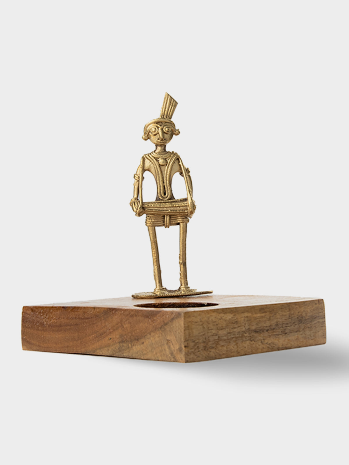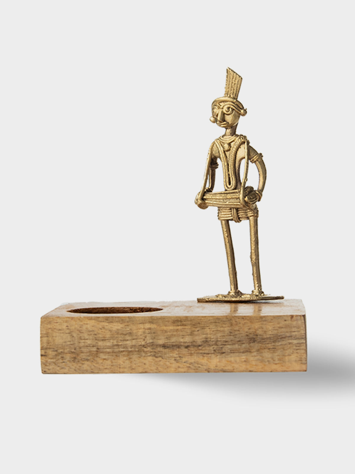 Experience the harmonious blend of tradition and innovation with the Dokra Tlight Musician. This unique figurine seamlessly fuses traditional Dokra art with wood, portraying a skillful musician playing the drum. The wooden base not only supports the artwork but also serves as a tealight holder, adding a warm glow to its eco-friendly elegance. Certified by Geographical Indication from Bengal, this versatile masterpiece can grace your space as a tealight or stand alone as a captivating tabletop accent.