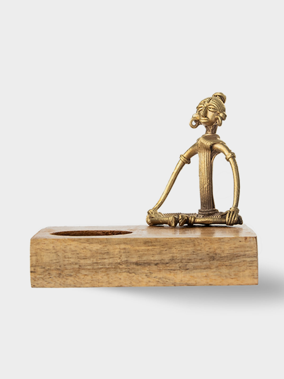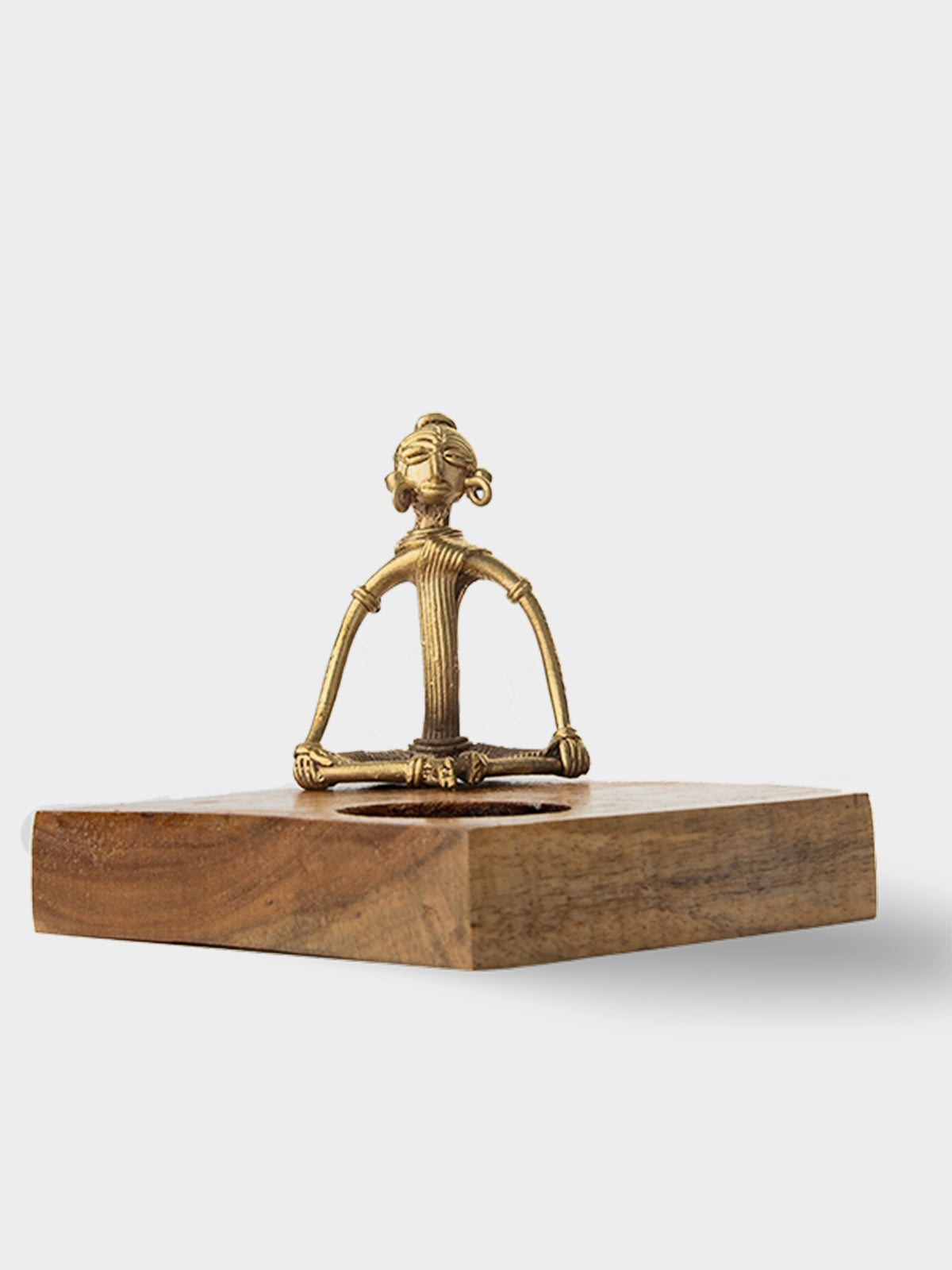 Embark on a serene journey with the Dokra Tlight Yogi, a fusion of traditional Dokra art and wood. This tranquil figurine features a Yogi in padmasana, gracing a wooden base that ingeniously doubles as a tealight holder. Certified by GI, this eco-friendly masterpiece from Bengal offers versatility as both a tealight and a tabletop accent, radiating harmony and artistry.