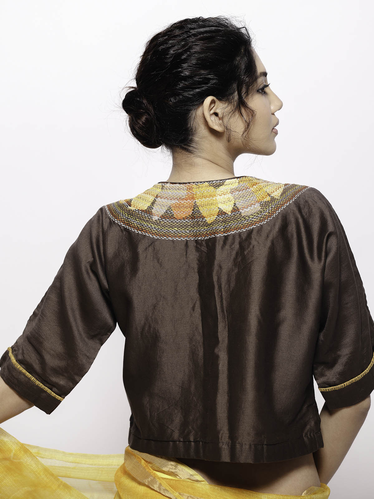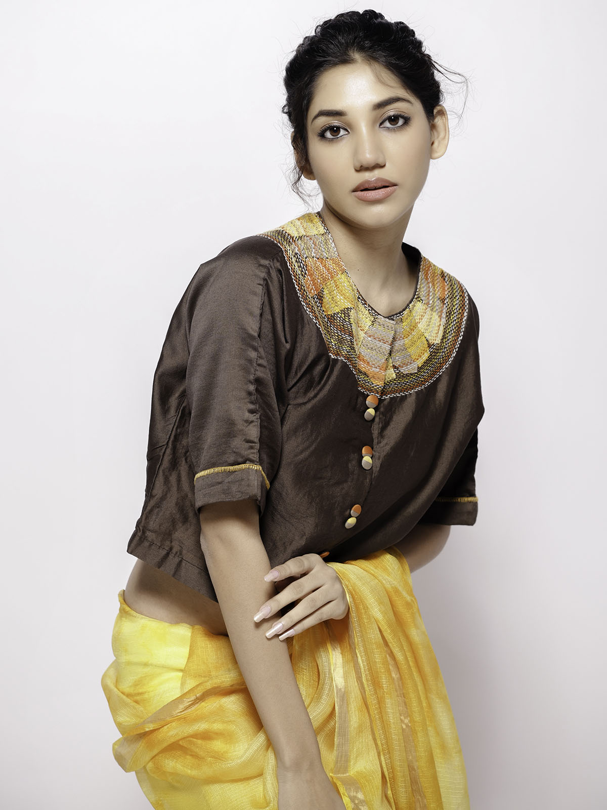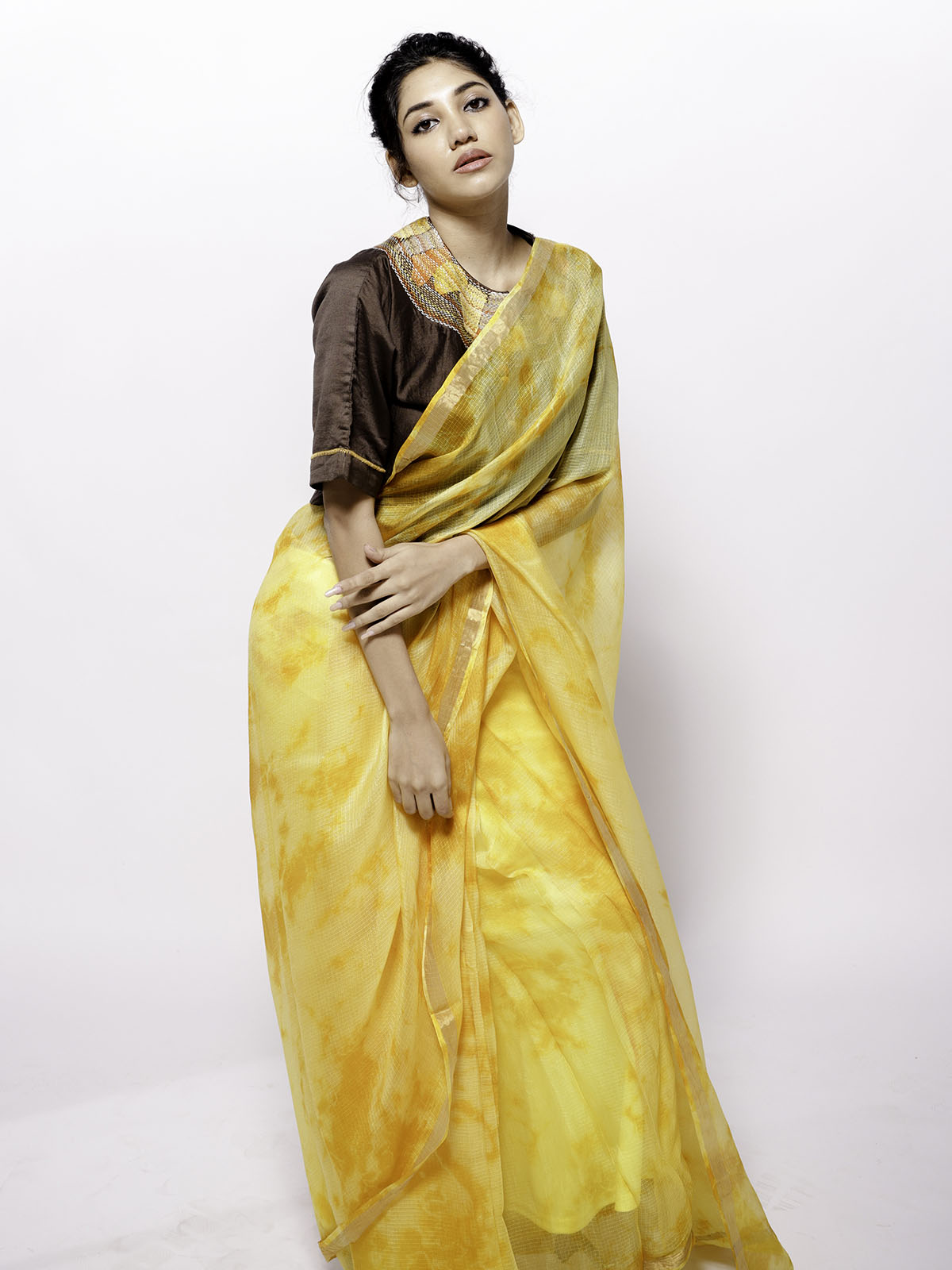 This yellow hand tie and dye kota doria silk saree showcases a refined gold zari border that adds a subtle yet luxurious shimmer to the delicate fabric. The saree’s lightweight texture makes it comfortable for extended wear, ideal for both festive occasions and formal events. Paired seamlessly with this is a deep brown chanderi crop top, featuring detailed sujani embroidery that brings a rich, artisanal touch to the ensemble. The combination of traditional craftsmanship and contemporary style offers a distinguished look, reflecting expert tailoring and heritage textiles in perfect harmony.