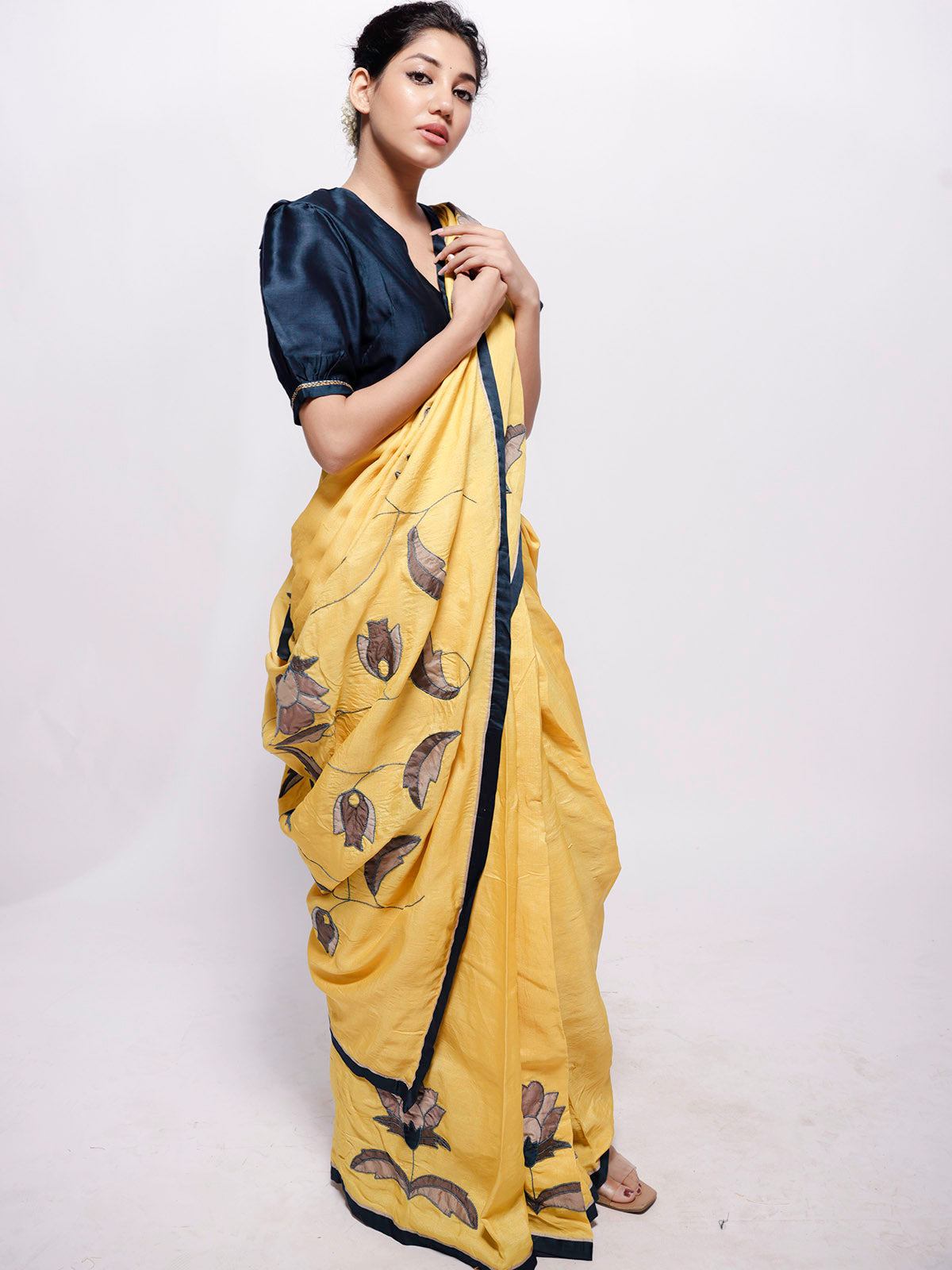 Yellow wild silk saree with floral applique work on palla and hem. The saree has 1 inch of teal chanderi border finishing. The saree is paired with a stitched v neck and puff sleeve teal chanderi sujani embroidered blouse for styling purpose only. Comes with an unstitched wild silk teal blouse piece.