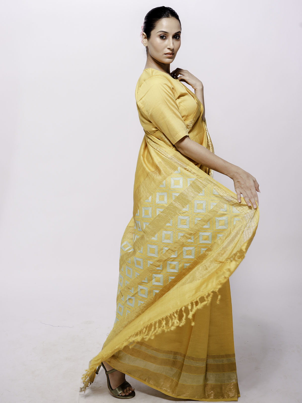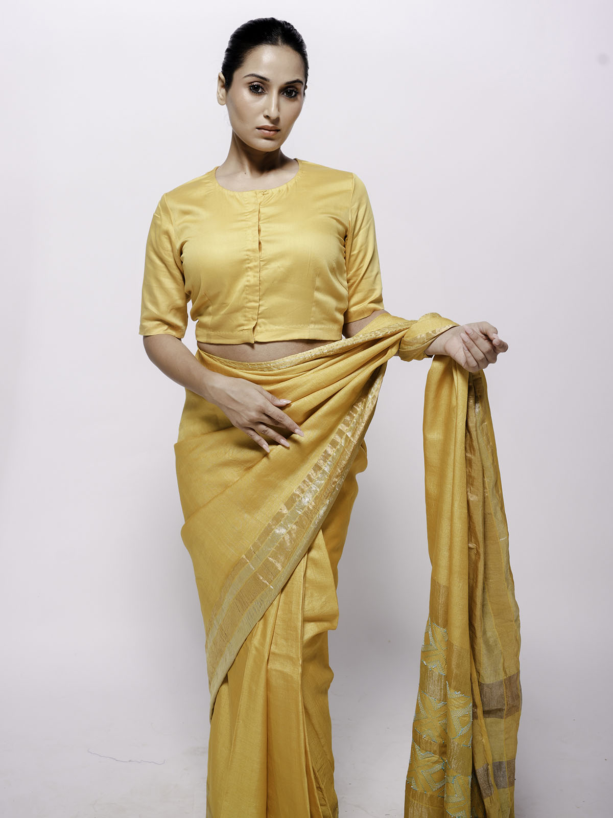 Yellow Wild Silk saree with woven zari borders and palla is embroidered in sujani , zari and tassels. The saree paired up with a fine premium cotton blouse for styline purpose only. Comes with an unstitiched blouse piece in same colour.