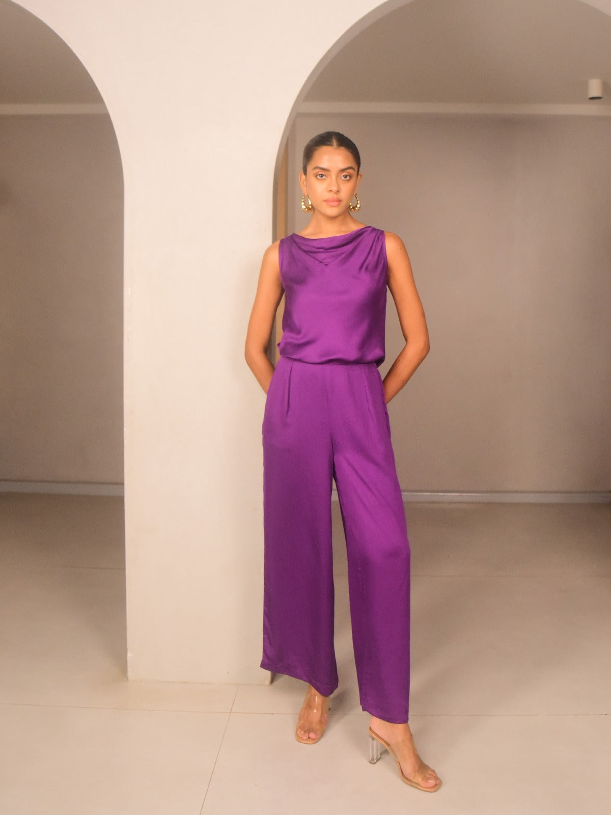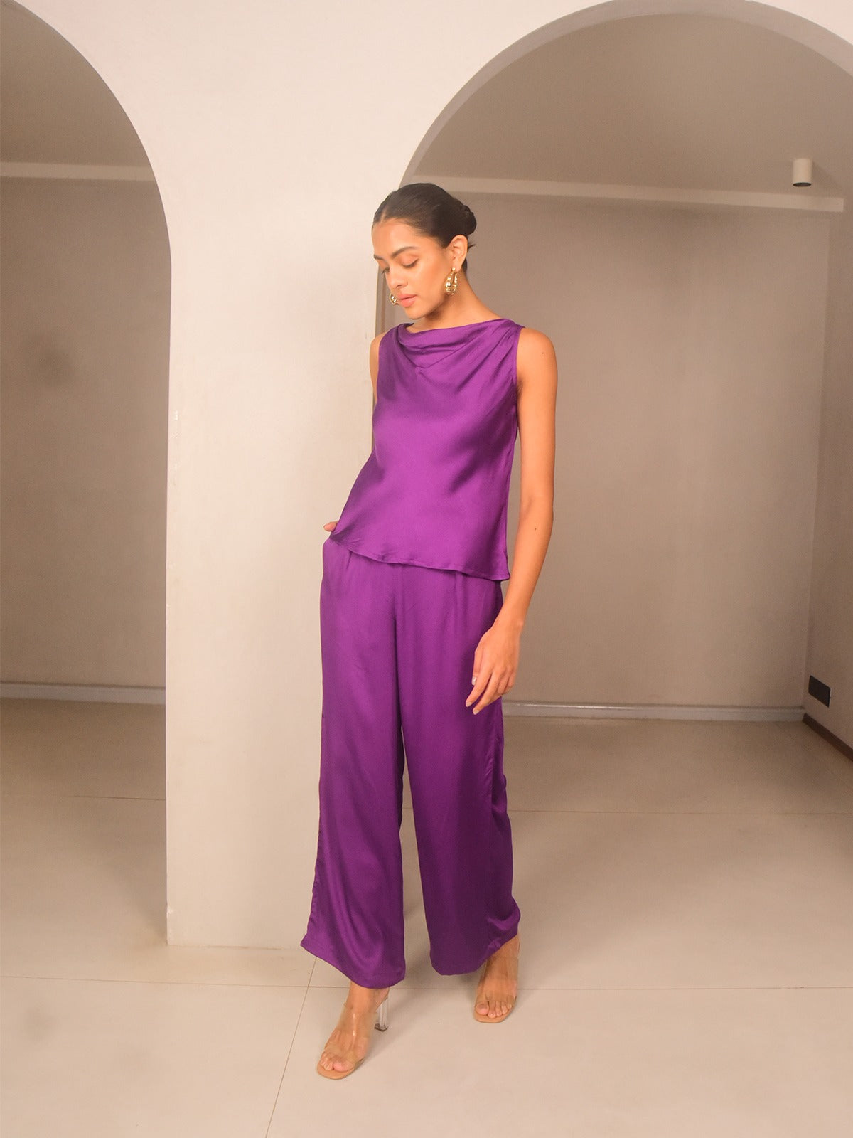 Delicately cut in a lustrous purple modal satin, this sleeveless cowl top is a modern take on festive elegance. The fluid neckline and clean back zipper offer a refined silhouette that transitions seamlessly from day to evening. Ideal when styled with our matching straight pants or tucked into a high-waist skirt for a more elevated look.