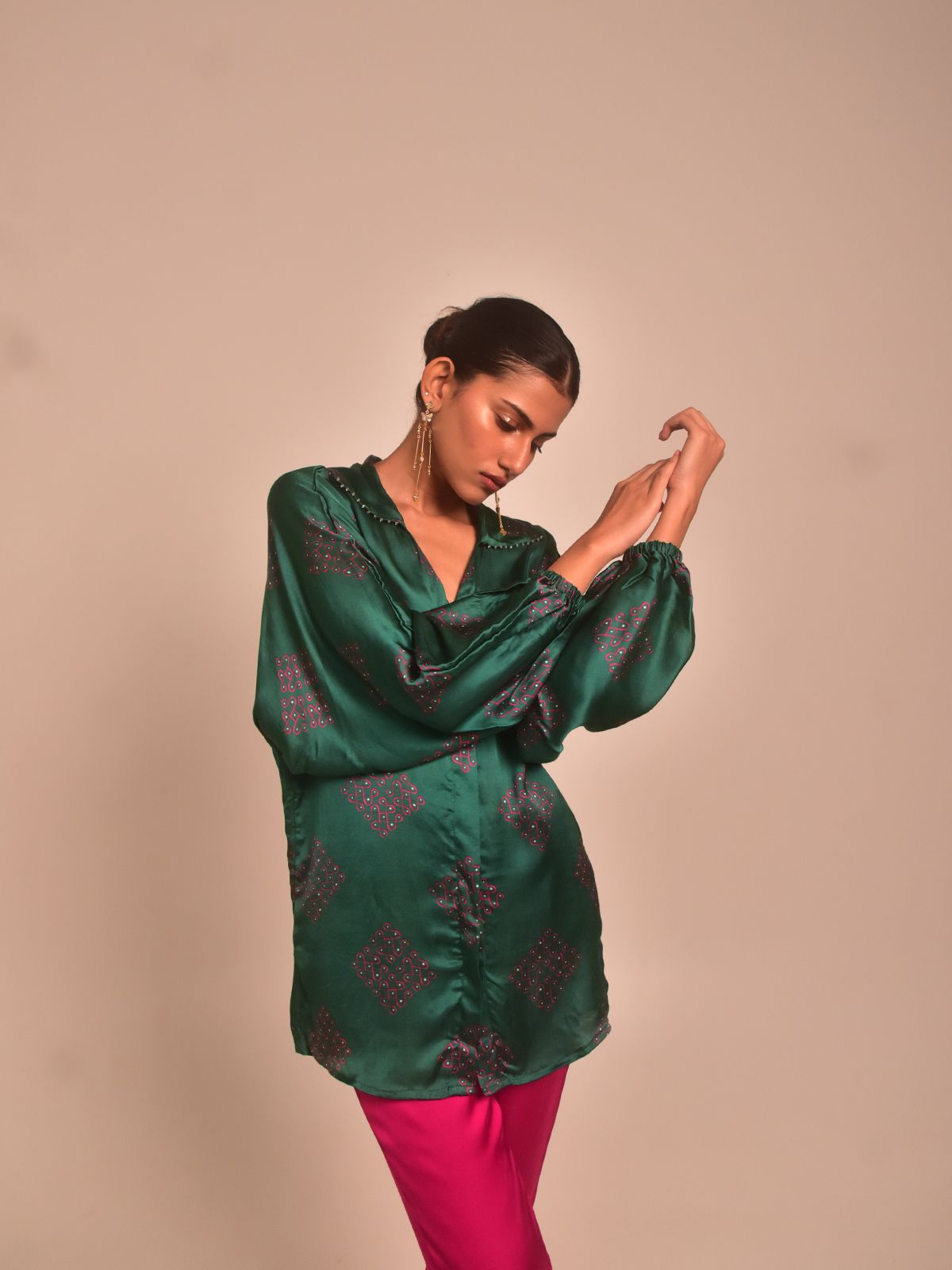 Our oversized shirt in green kolam printed modal satin features balloon sleeves and a 6-inch loosing for relaxed sophistication. The embellished collar adds a festive sparkle, pairing best with our fuchsia pink pants. Great for mehndi events or festive dinners, finish the look with bold studs and mules.