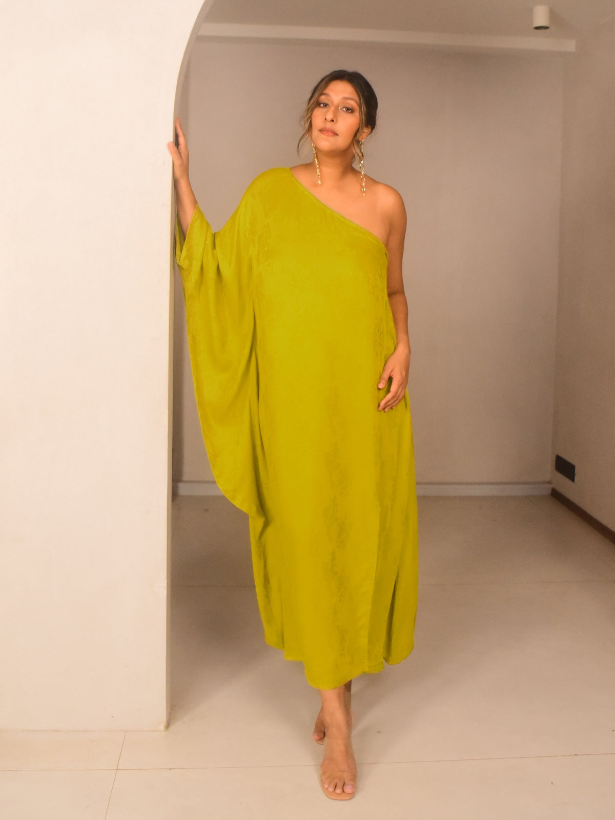 A one-shoulder silhouette in breezy lime green viscose modal jacquard, this long kaftan dress features a side slit and relaxed drape for free-flowing movement. Ideal for daytime festive events or laid-back celebratory evenings, it pairs well with statement accessories for an effortless look.