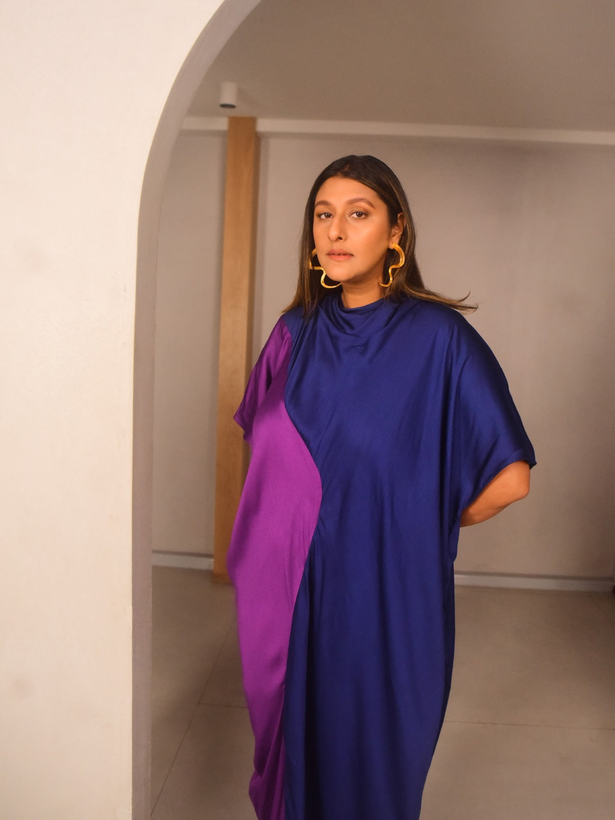 A celebration of fluid form and color play, this oversized dress is crafted in contrasting asymmetric panels of dark blue and purple modal satin. With a relaxed silhouette, it features a soft cowl neckline, keyhole back with a hook-and-eye closure, and a flowing asymmetric hem that moves with ease. This piece is perfect for day-to-night festive dressing just add bold earrings and flats or heels.