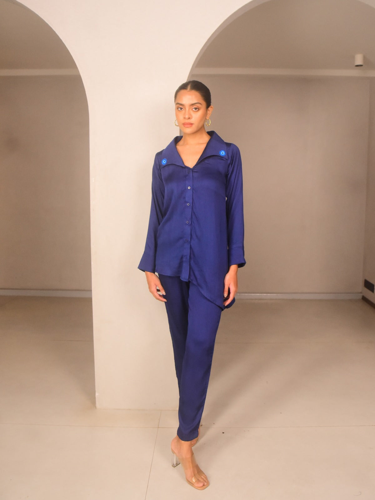 Refined yet relaxed, this co-ord set in deep blue modal satin makes a sophisticated statement. The shirt features oversized collars adorned with delicate hand-embroidered floral motifs, a button-down front, and an asymmetric hem that adds a modern edge. Paired with tailored narrow pants featuring a front zip, button closure, and practical side pockets, this set transitions effortlessly from festive brunches to evening get-togethers. Finish the look with statement studs and classic loafers or heels.