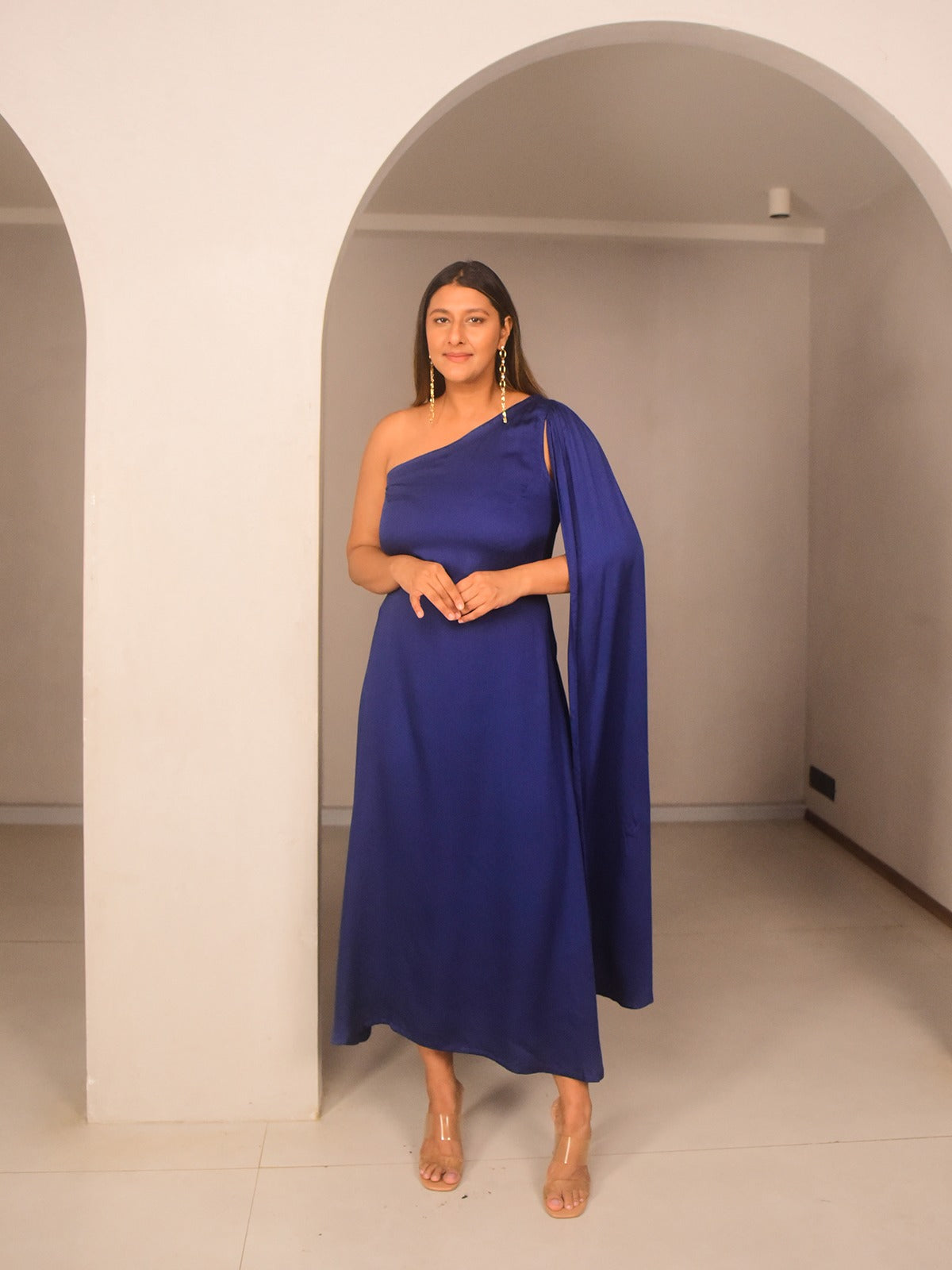 Striking yet sophisticated, this set is crafted in luxurious dark blue modal satin with a subtle play of contrast and texture. The shirt features a triangular cobalt blue yoke, balloon full sleeves, a V-neckline, and a classic collar lending structure to its fluid drape. It's paired with a matching drape skirt that features a knotted front detail, front slit, and back zipper for ease and elegance. Style this elevated look with metallic accessories and block heels for festive evenings that call for modern flair.