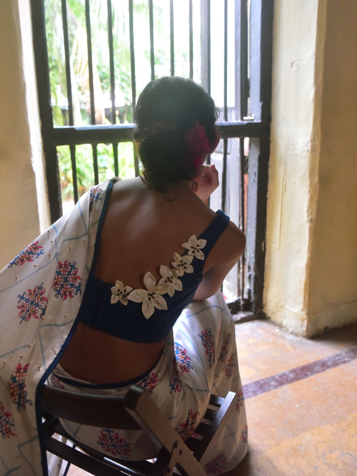 Crafted from cobalt blue modal satin, this sleeveless blouse is designed with floral applique and intricate bead embroidery on the front and back neckline. Padded for comfort and finished with a hook-eye closure, it adds a festive statement to any saree. Pair it with our cream kolam printed saree for a sophisticated and bold contrast, and style with chandbalis and a sleek bun.