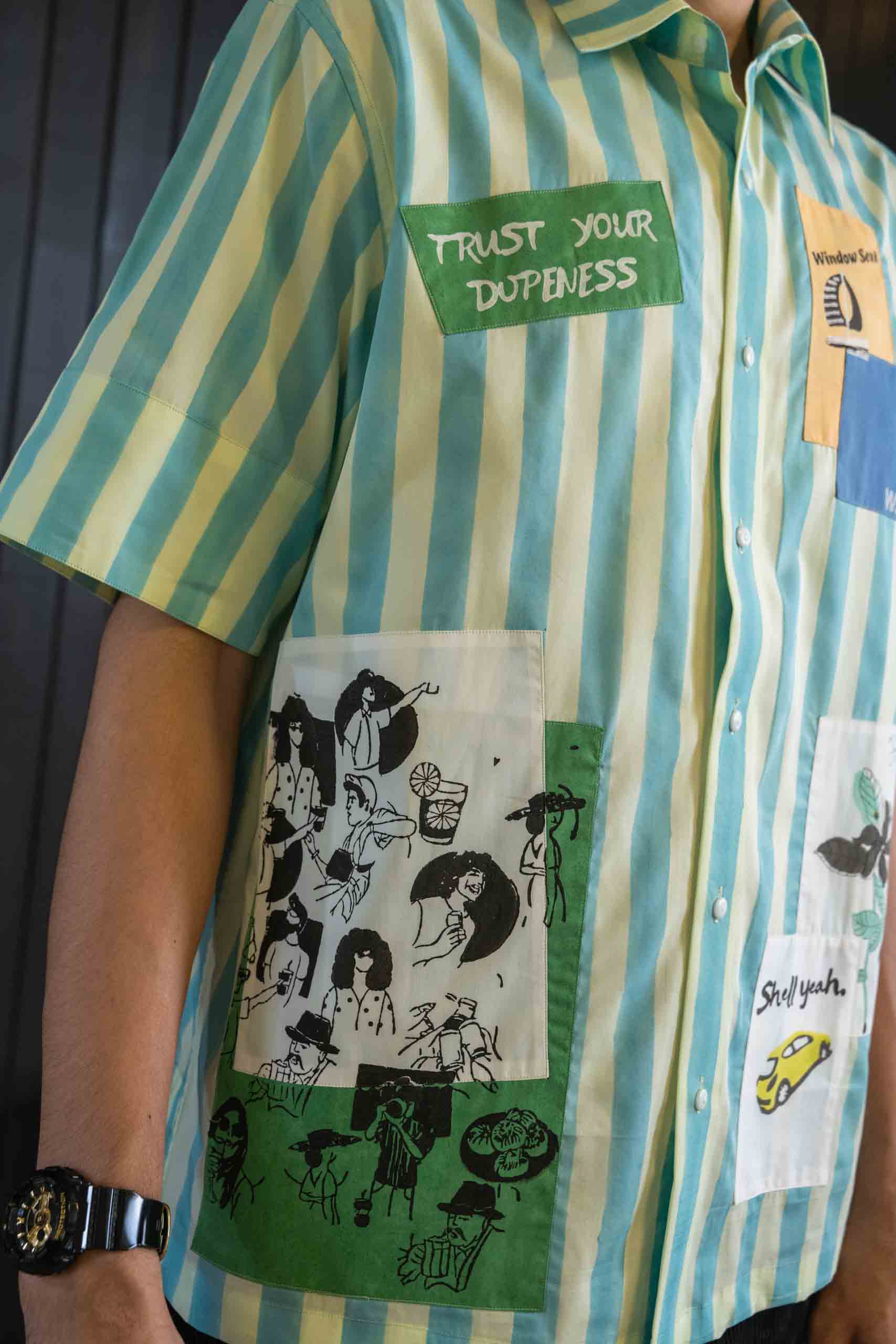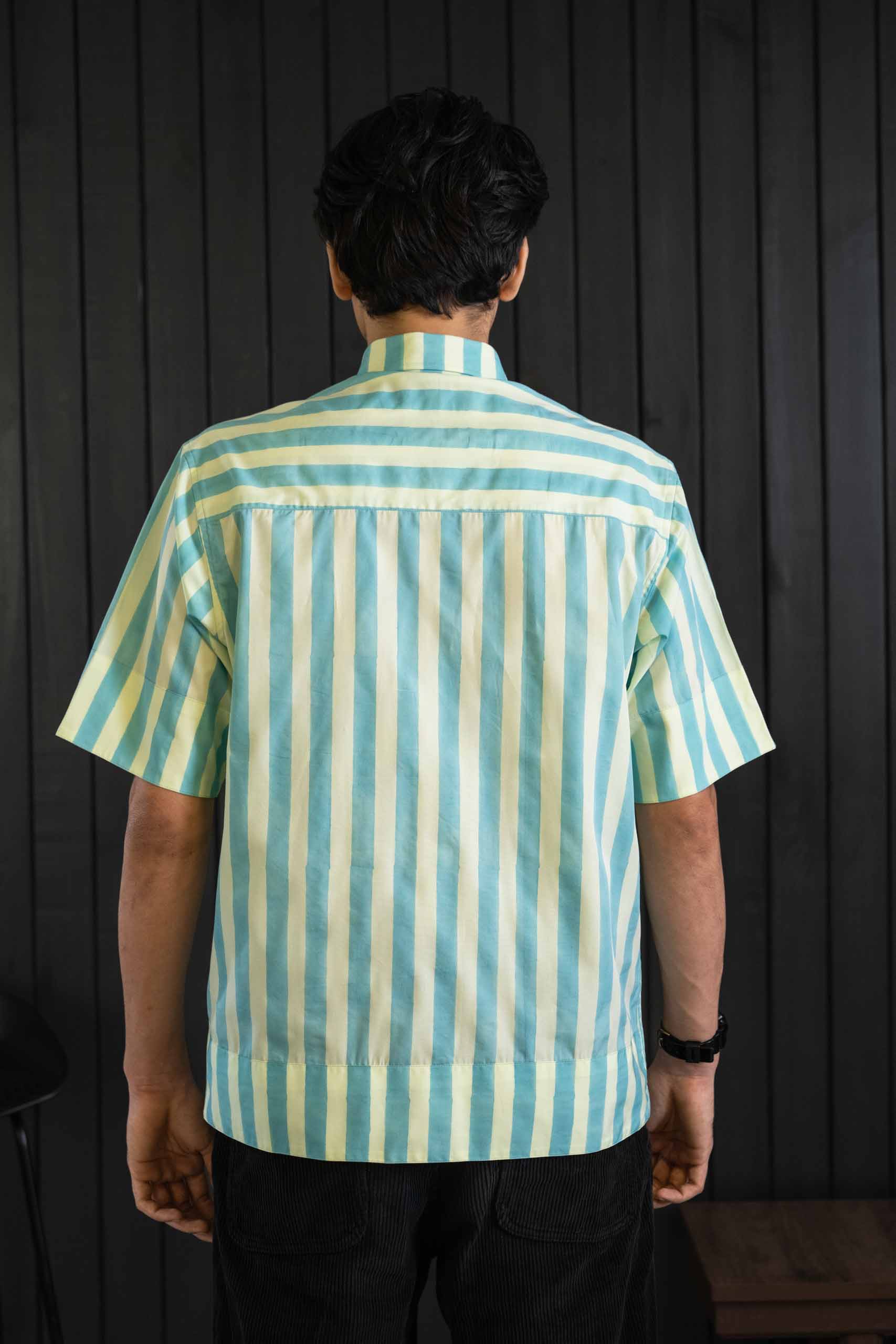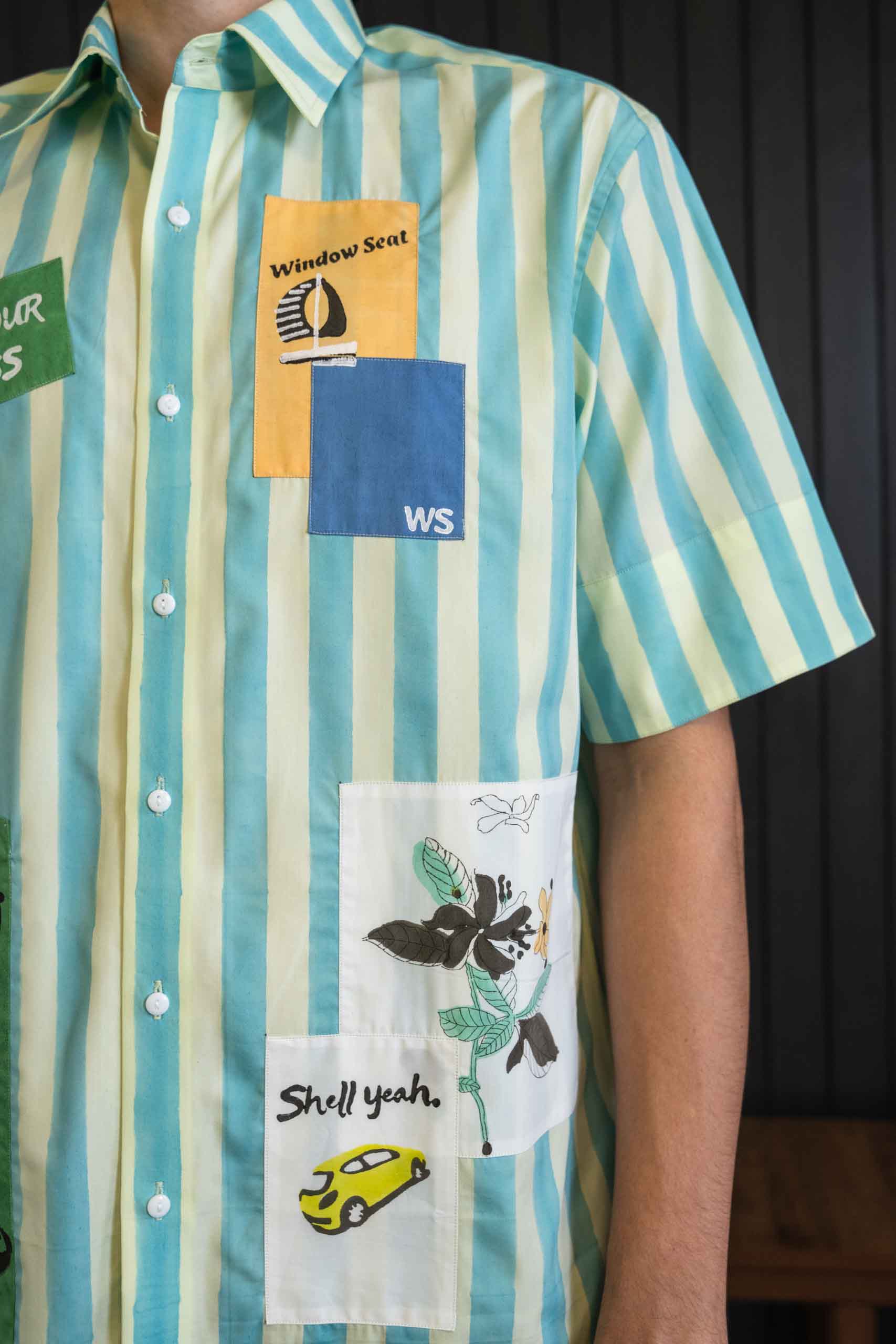 Green and blue stripes meet playful patchwork in this short-sleeved cotton–tencel shirt. Sturdy buttons, breathable fabric, and refined finishing create casual sophistication. Lightweight, comfortable, and effortless, it pairs elevated craftsmanship with relaxed energy, offering wearable artistry that balances structure, ease, and modern aesthetic for those who value versatile, thoughtfully designed wardrobes.
