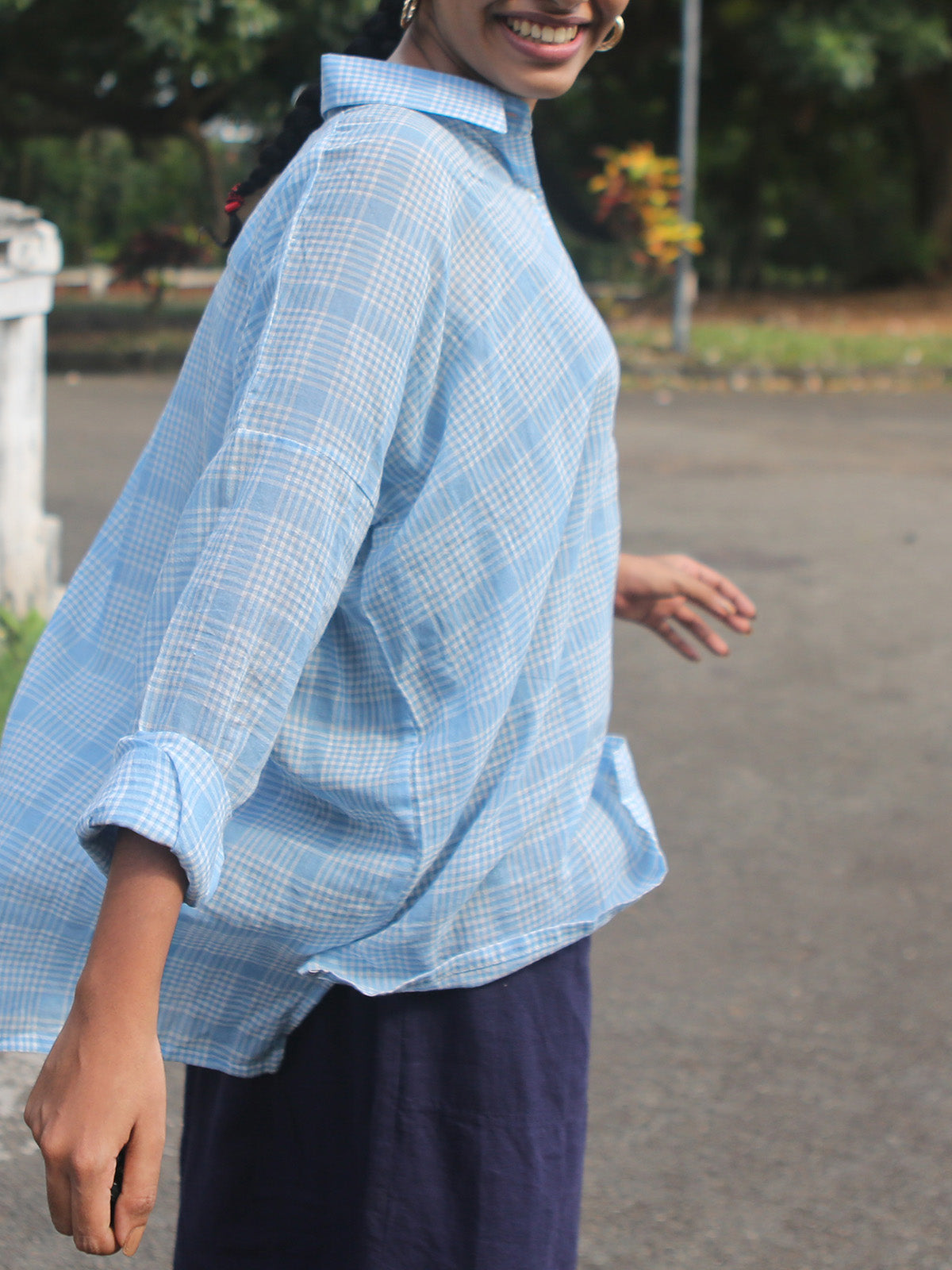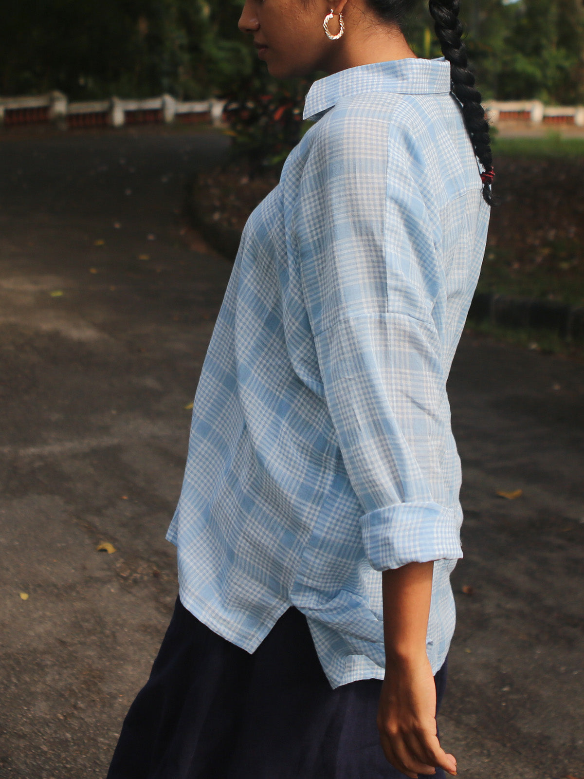 Experience the sensation of flowing like a river and feeling light as air with this exceptional oversized shirt. Unparalleled in comfort, it envelops you in a relaxed and laid-back vibe. Crafted in soft indigo and white hues, it exudes a casual yet sophisticated appeal. The drop shoulders and uneven hem add intriguing details to its design.