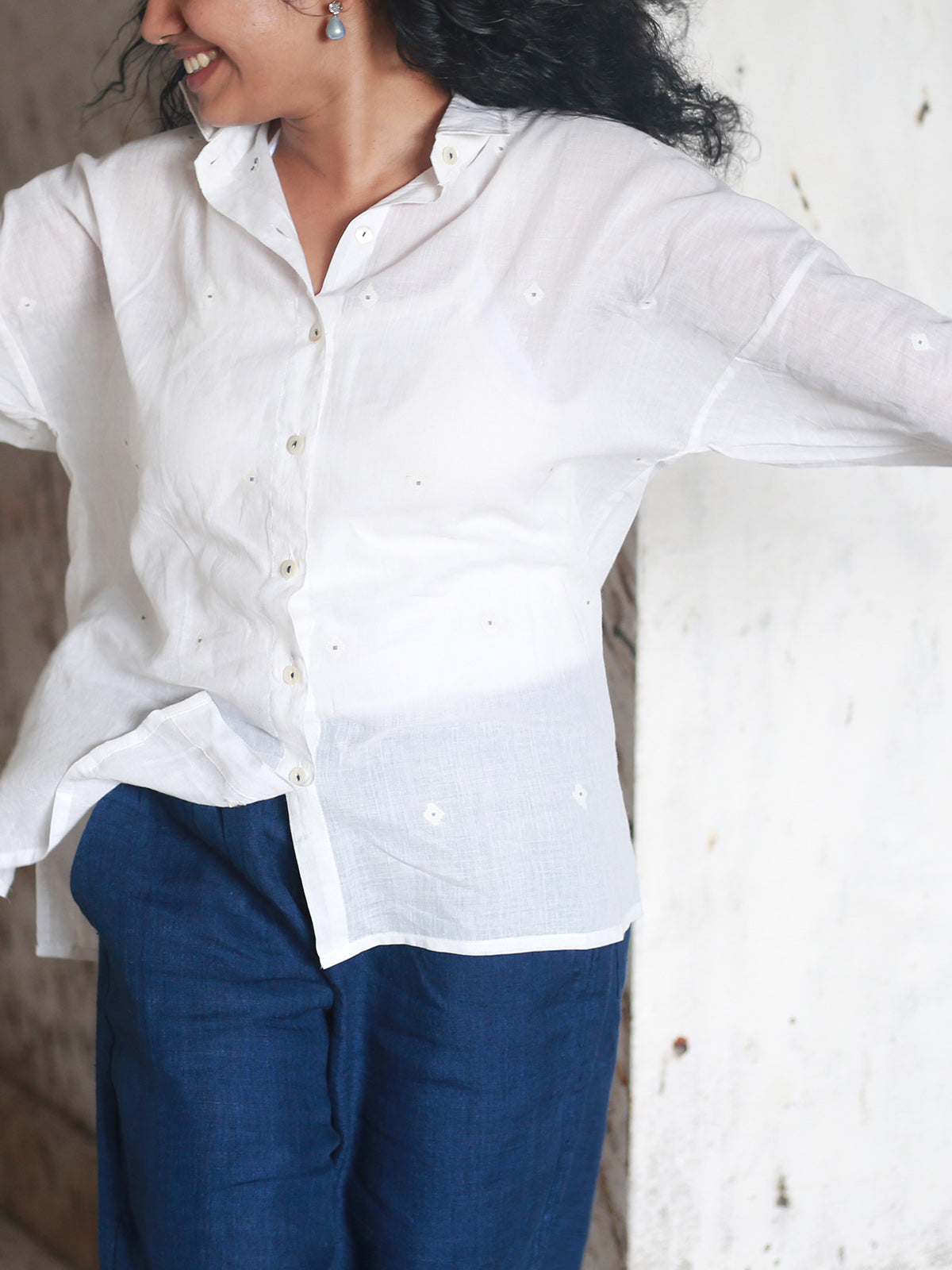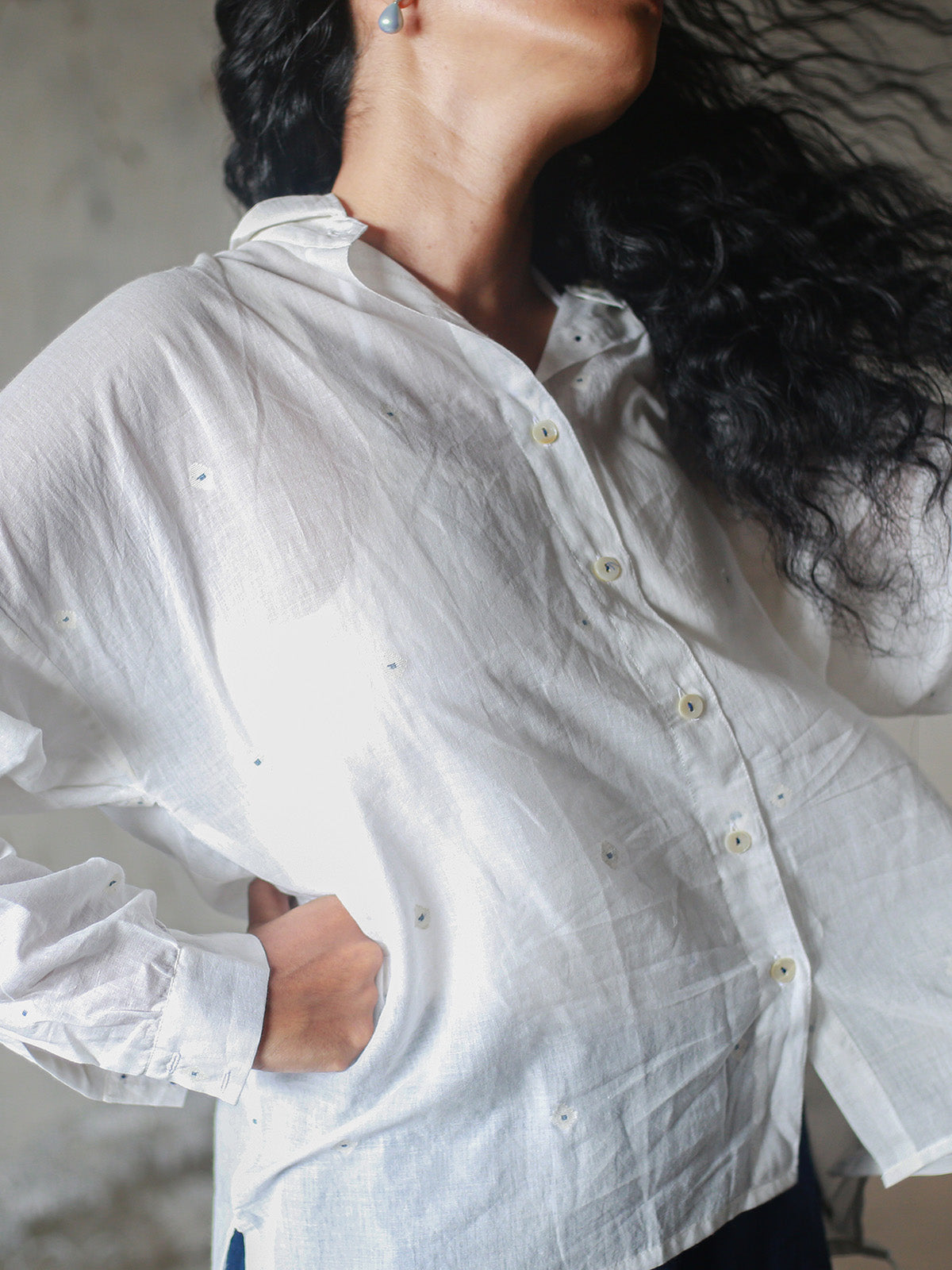 Introducing an exquisite, oversized shirt adorned with diamond shaped Jamdani motifs. This shirt is a true fusion of elegance and comfort. With its drop shoulders and box pleat at the back, it effortlessly combines relaxed and sophisticated styles. The uneven hem adds a touch of uniqueness to its design. Available in dual sizes, this shirt ensures a perfect fit for a wide range of individuals.