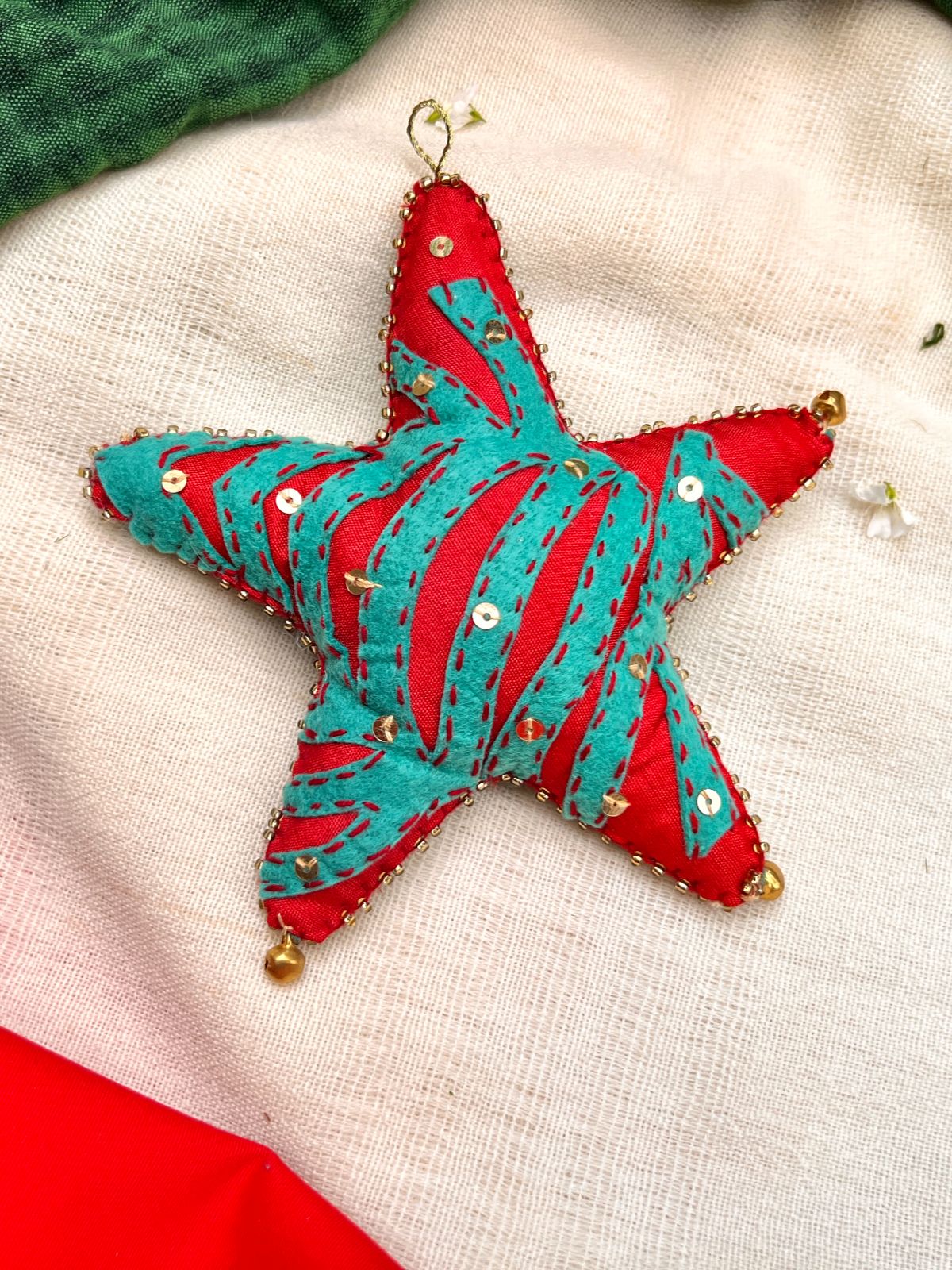 Celebrate the season with this exquisite handcrafted Christmas ornament, where artisanal cutwork and appliqué techniques converge to create festive brilliance. Each piece showcases delicate hand embroideries adorned with subtle glitter and luminous shine, capturing the magic of the holidays. Crafted from carefully curated leftover fabrics, this star ornament is genuinely one-of-a-kind—no two pieces are identical. A testament to sustainable craftsmanship and timeless elegance, it transforms your tree into a gallery of bespoke artistry while honoring eco-conscious design principles.