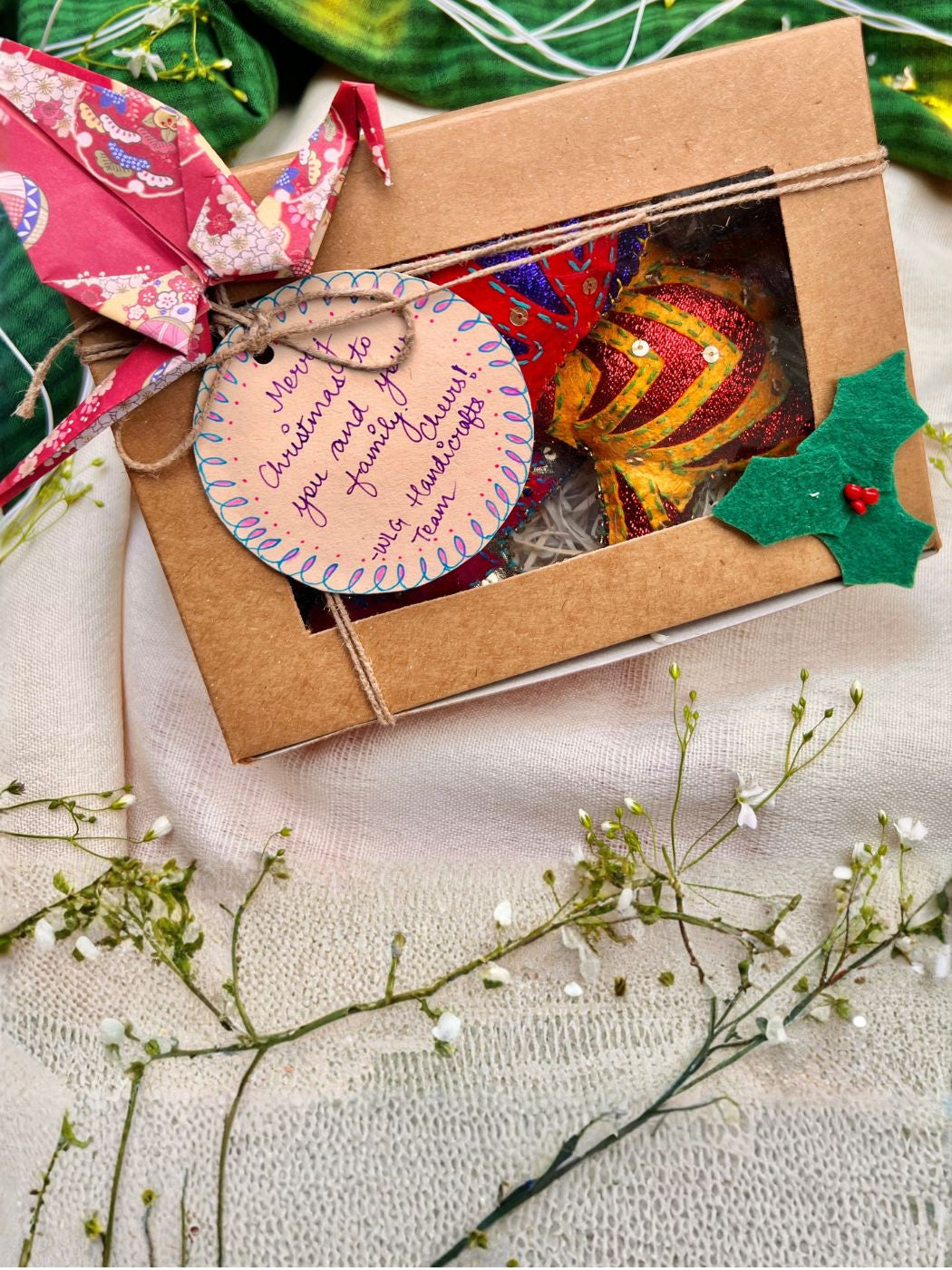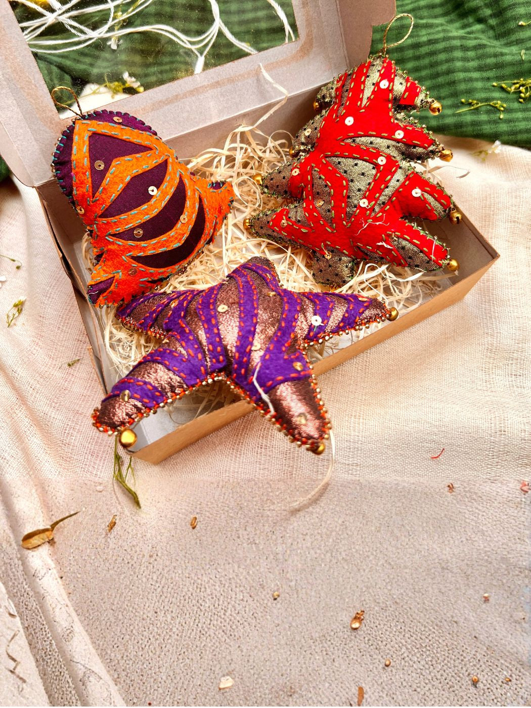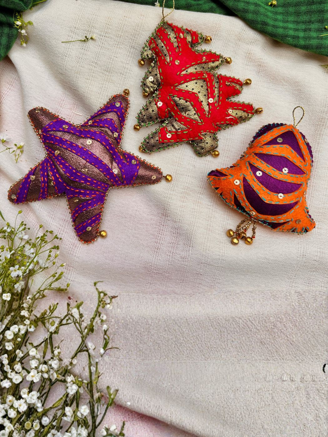 Celebrate the season with this enchanting Cutwork Applique Christmas Set featuring a star, tree, and bell. Each ornament showcases meticulous hand embroideries and intricate cutwork appliqué techniques, creating delicate details that catch the light beautifully. Crafted from carefully selected leftover fabrics, every set contains unique color combinations, ensuring your decorations are truly one-of-a-kind. The subtle shimmer and artisanal craftsmanship bring festive elegance to your holiday display while supporting sustainable, mindful design practices.