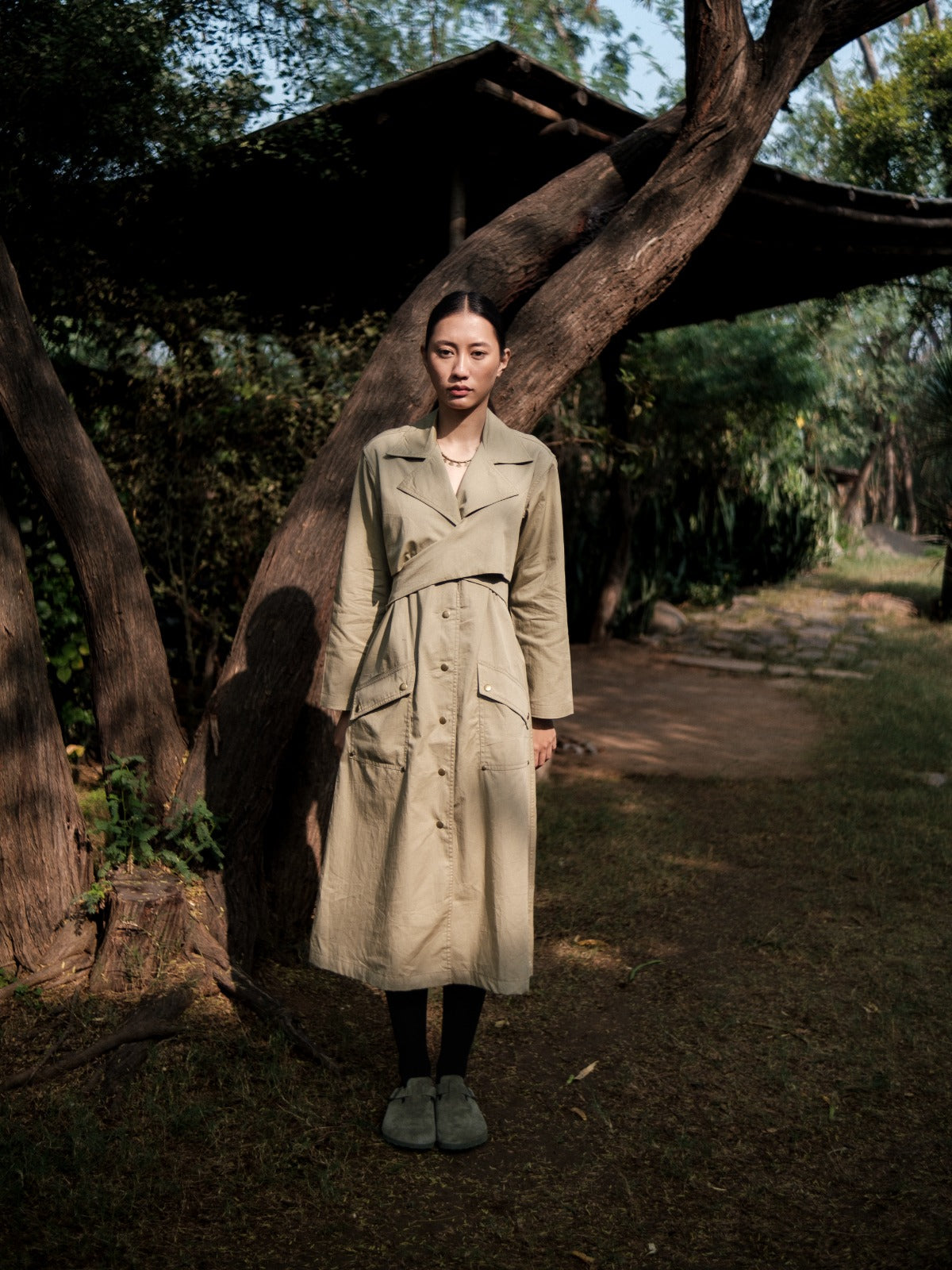 A versatile trench coat that combines a refined notch collar, buttoned front, and elegant wrap detail. Its timeless silhouette makes it a year-round essential, balancing practicality with style. Perfect for layering, it elevates any outfit with polished simplicity, offering both functionality and modern sophistication for any occasion.