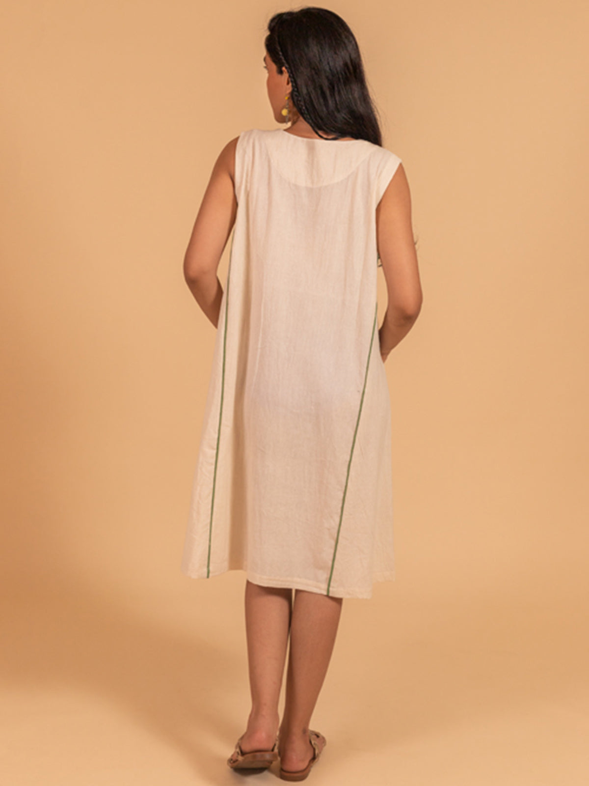 Moral Fibre sleeveless V neck Ecru Dress is A line features side panel. The contrast color pipin adds element of design & functional hidden pockets along the pipin. This cool comfortable, versatile dress adapts top tour mood to wear it for all outings.